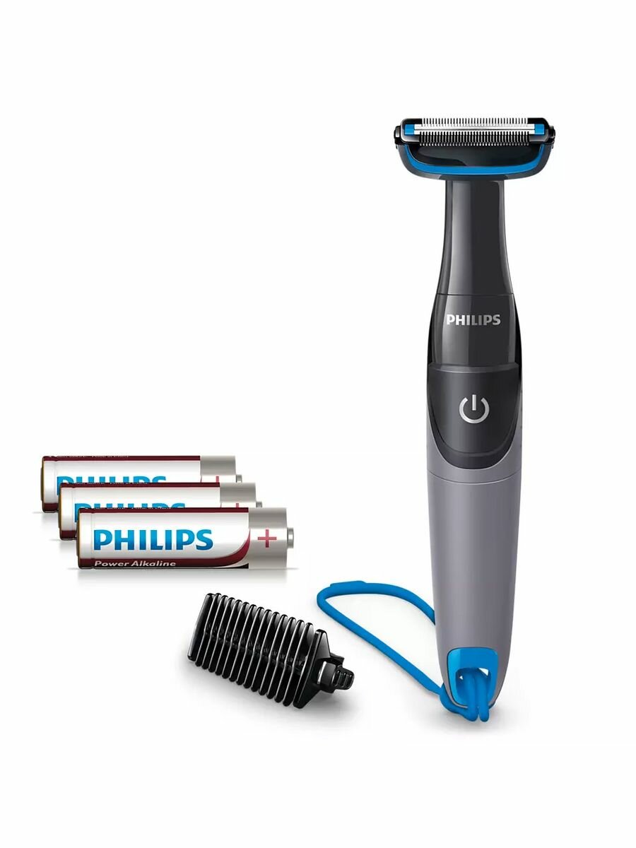 Беспроводное использование благодаря аккумулятору типа АА: Philips Bodygroom готов к использованию в любое время и в любом месте. В комплект входят две дополнительные батарейки типа АА, всего три батарейки. Для оптимальной работы при сроке использования одной батареи до двух месяцев используйте высококачественные щелочные батарейки Philips типа АА. Производительность аккумулятора и время работы могут различаться в зависимости от типа волос и частоты использования.