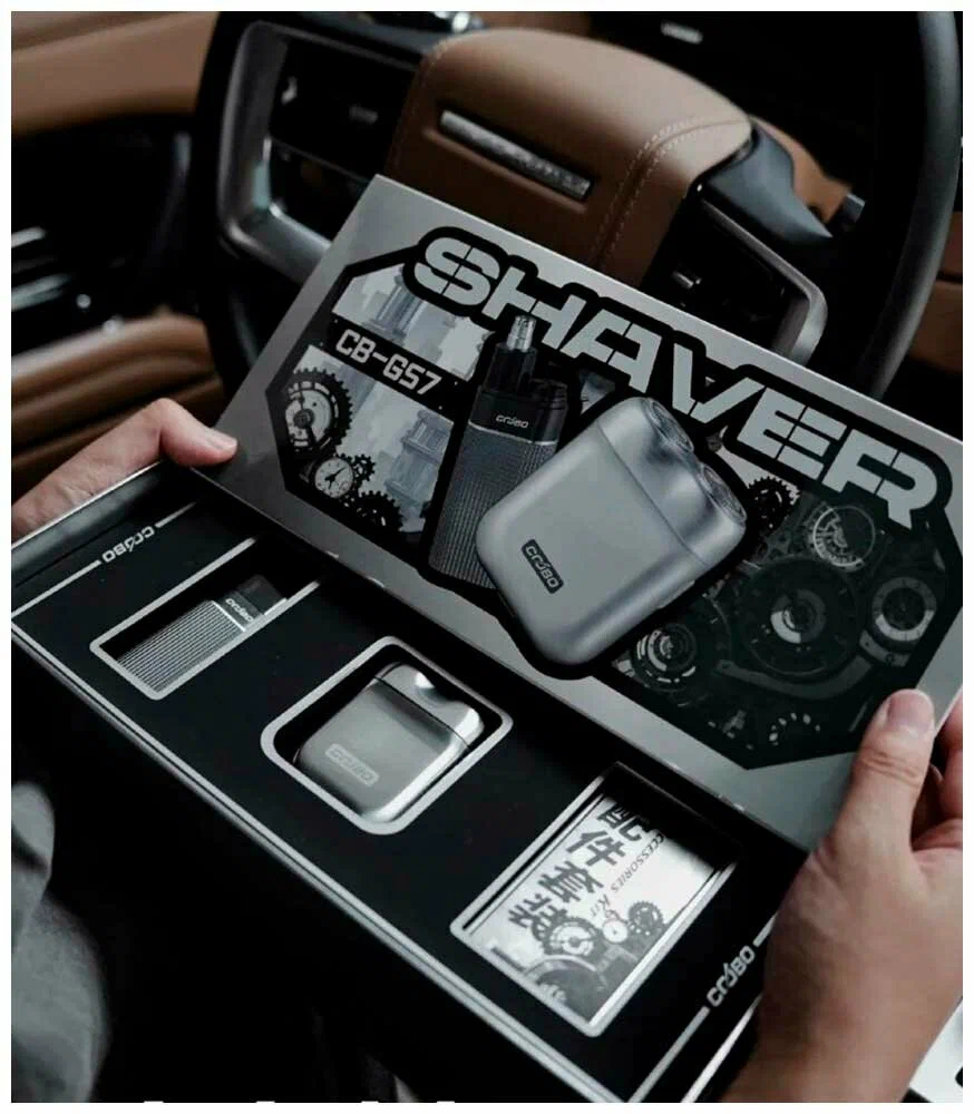 Бритва, триммер для носа, чехол для хранения, зарядный кабель, батарейка для триммера, щеточка для чистки.