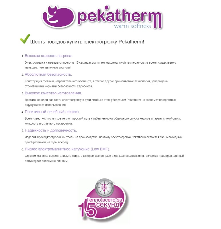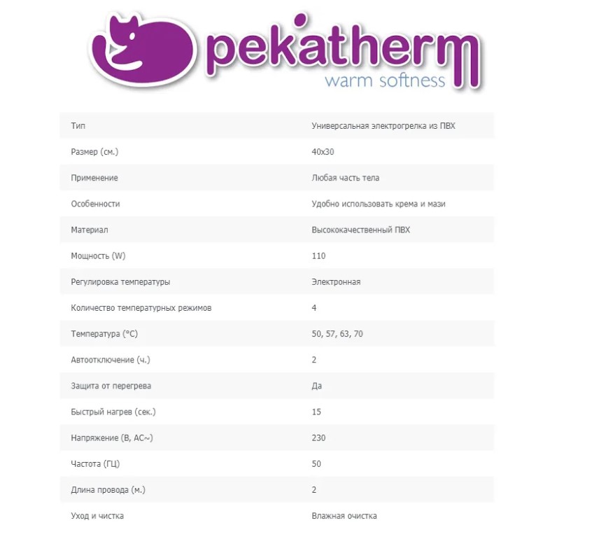 Начните заботиться о самих себе с Pekatherm и почувствуйте тепло, которое вы заслуживаете Pekatherm желает, чтобы вы позаботились о себе, улучшили качество своей жизни и воспользовались всеми преимуществами, которые несёт в себе тепло. Наша продукция максимально безопасна и проста в использовании, поэтому хорошо впишется в ежедневный ритм вашей жизни…Тепло способствует циркуляции крови, выводит токсины, расслабляет и способствует отдыху. Обратите внимание! Эта грелка незаменима для использования с мазями, гелями, лечебными грязями, влажными компрессами. Так же предназначена и для сухого применения. Электрогрелка помогает восстановиться после напряженного рабочего дня или длительного пребывания на холоде, снять нервное напряжение и расслабиться, поднять настроение. Попробуйте! И Вы убедитесь в этом сами!