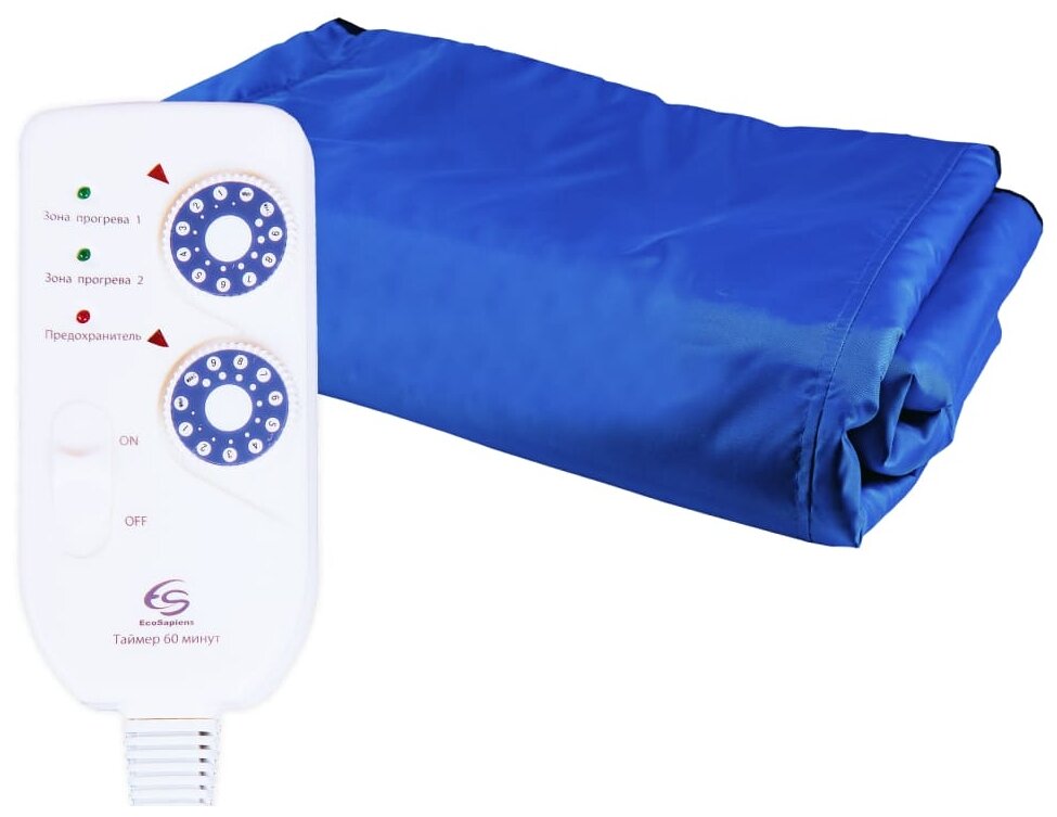 размер одеяла 180 x 220 см, материал - нейлон, материал нагревательного элемента - карбоновое волокно, влагостойкий материал чехла с высокой износостойкостью, один пульт на 2 зоны прогрева, 9 режимов прогрева от 35 С до 55 С градусов, изготовлено в соответствии с требованиями косметологии