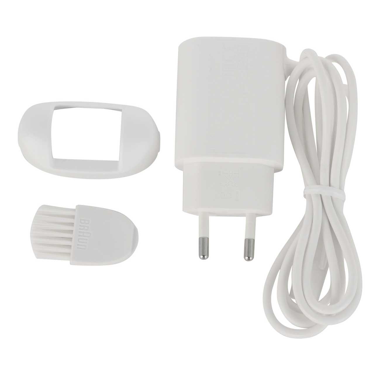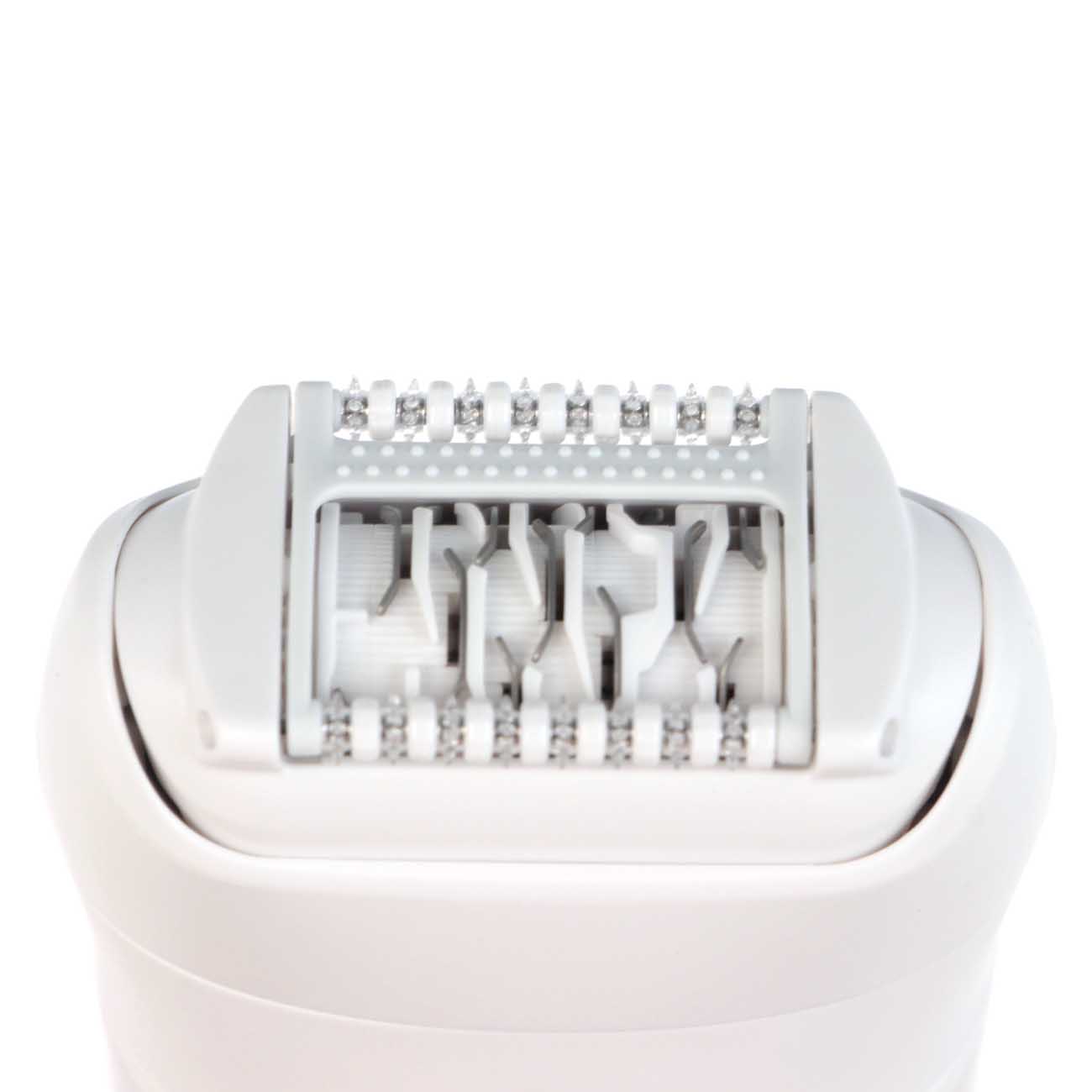 Подробная комплектация эпилятор, насадка для более близкого контакта с кожей, насадка для высокочастотного массажа, щеточка для чистки, зарядное устройство