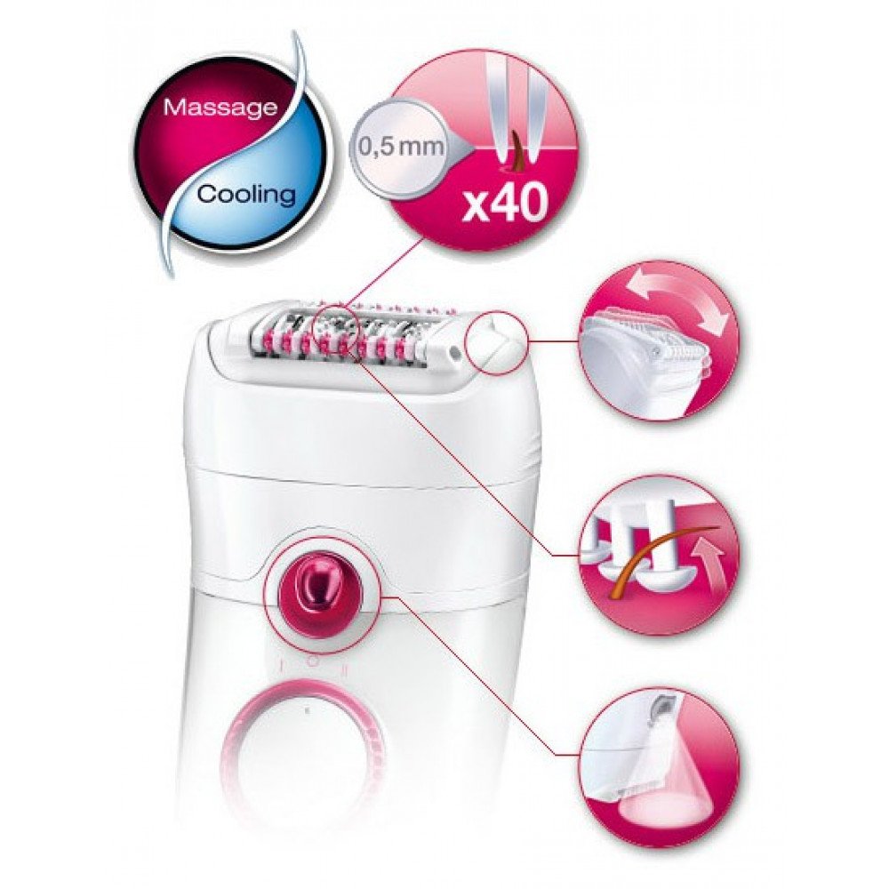 Описание Оснащен технологией удаления коротких волосков Close-Grip с 40 роликами с зубчиками, которые удаляют даже короткие и тонкие волоски. Система комфорта с массажными роликами, которые стимулируют и успокаивают кожу, и охлаждающей рукавицей для уменьшения болевых ощущений после эпиляции.