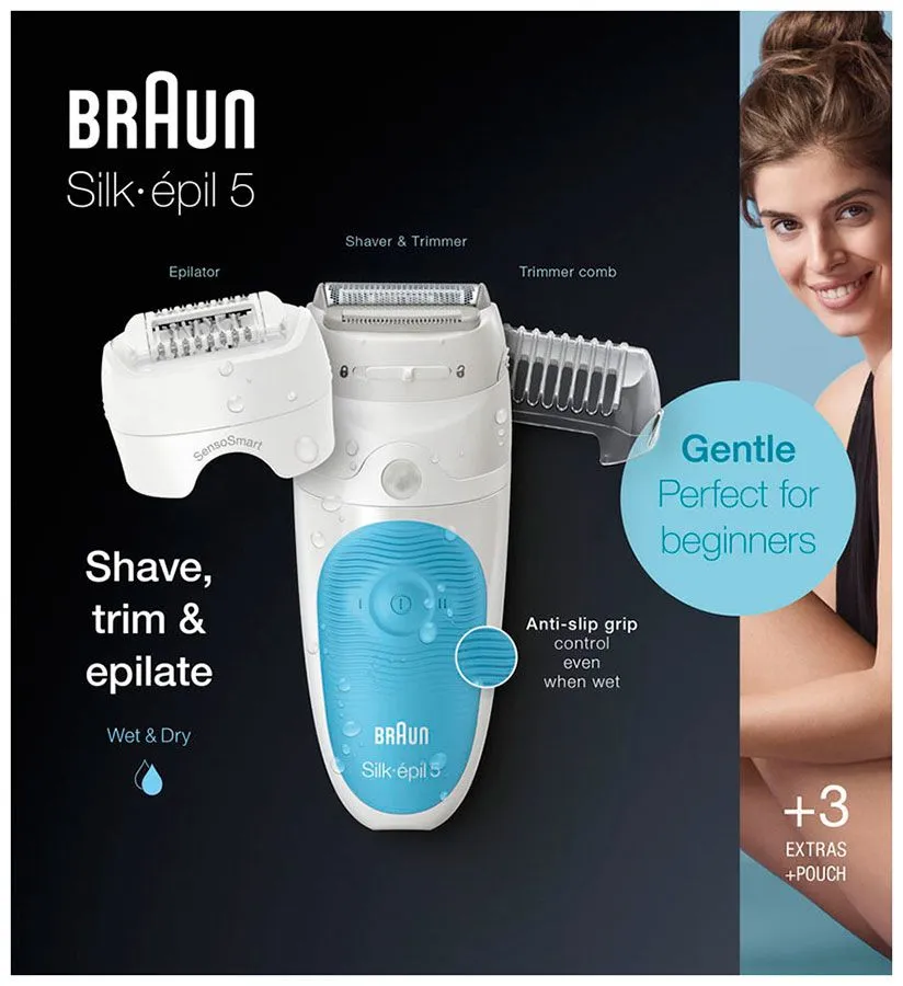 Особенности бритв, триммеров, эпиляторов: Чистка под струей воды, Нескользящая вставка на рукоятке, Влагозащищенный корпус