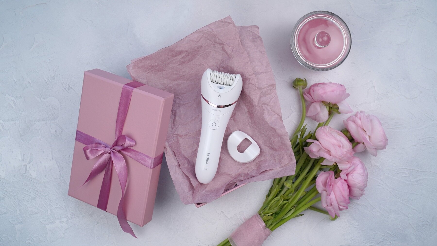 эпилятор, бикини-триммер с гребнем, насадка для оптимального контакта, насадка для чувствительных участков, насадка-триммер для линии бикини, чехол, щеточка для чистки, перчатка для пилинга, зарядное устройство