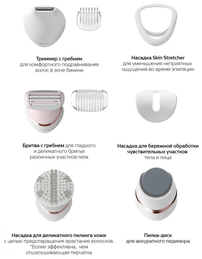 Насадки: для бритья, для педикюра, для пилинга, для точечного удаления волос, насадка для деликатных зон, насадка-ограничитель, насадка-триммер
