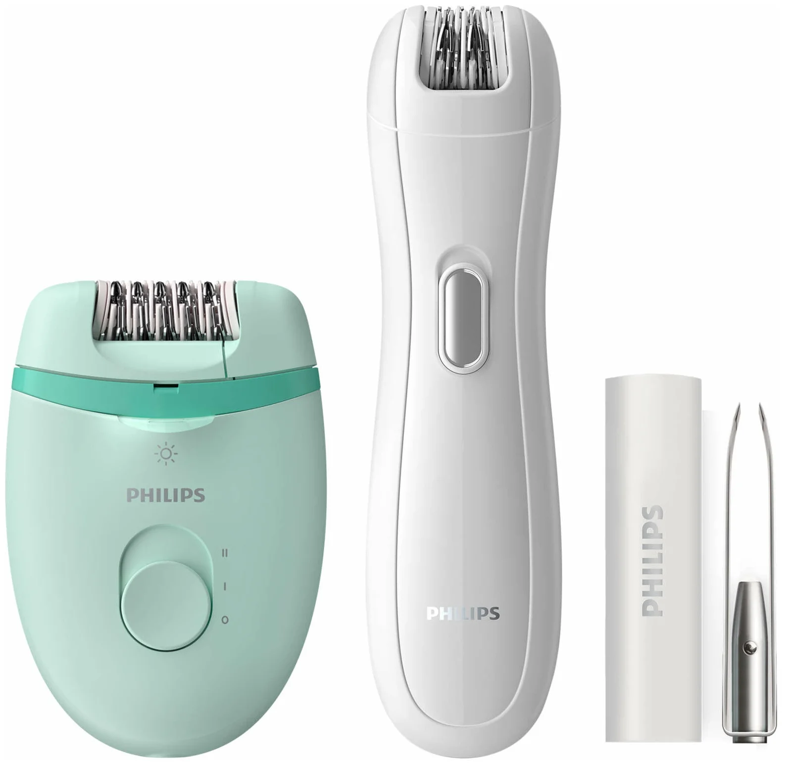 Дополнительная информация: эпилятор работает от сети, мини-эпилятор работает от 2 батереек типа АА (входят в комплект); у мини-эпилятора 8 дисков, 1 скорость; минимальная длина волос для эпиляции: 0.5 мм