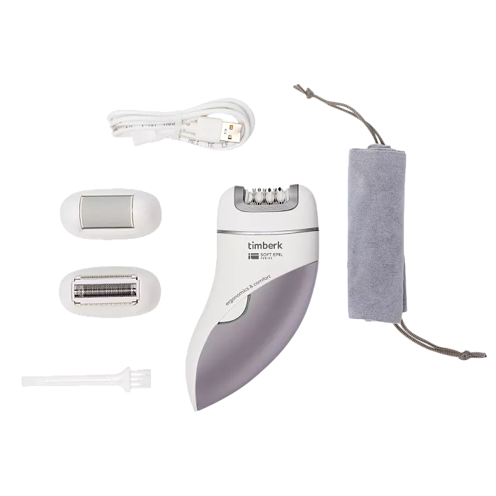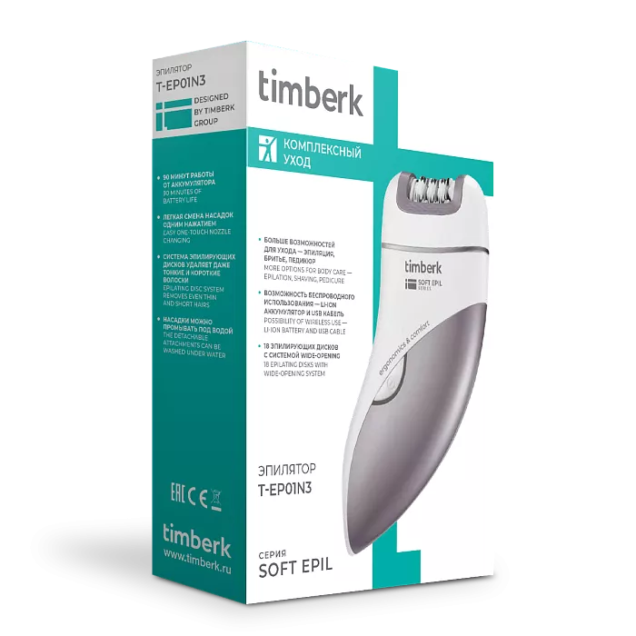 Эпилятор TIMBERK T-EP01N3 белый. Эпилятор Timberk T-EP01N3 предназначен для сухой эпиляции и имеет 18 эпилирующих дисков с системой wide-opening, захватывающих даже тонких и коротких волосков от 0,5 мм. В комплекте имеются две дополнительные насадки для бритья и роликовая пилка, которые дают больше возможностей для ухода за телом. Благодаря встроенному Li-ion аккумулятору эпилятор может непрерывно работать до 90 минут и полностью заряжаться за 120 минут. Функция plug and play позволяет использовать прибор как от аккумулятора, так и от сети (с помощью USB шнура). Входящие в комплект чехол и щеточка для чистки делают уход и хранение эпилятора проще и удобнее.