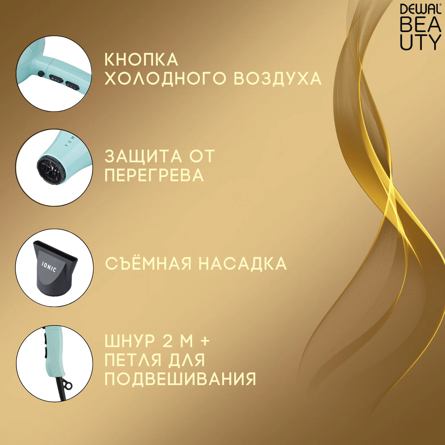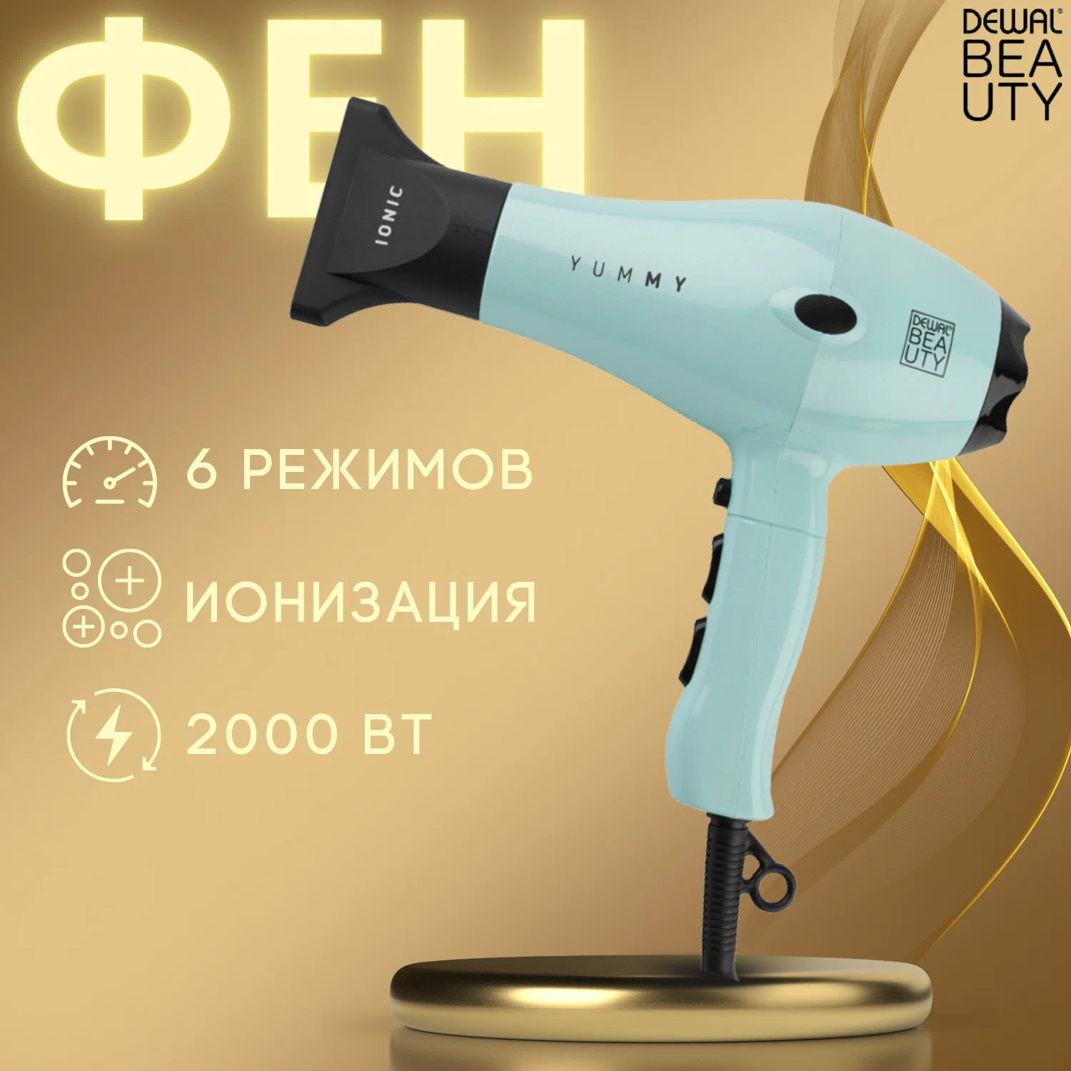 - Dewal Beauty представляет новую серию фенов YUMMY. Ассортимент отличается интересной цветовой гаммой. Эргономичный дизайн и удобная форма ручки создают идеальную балансировку, фен комфортно лежит в руке. Кнопки переключения температурных режимов расположены спереди, что создает дополнительные удобства при работе.Фен Dewal Beauty Yummy оснащен мотором АС, моторы AC используются в профессиональных фенах и рассчитаны на непрерывную работу в течение 8-10 часов. Срок службы таких моторов составляет 1800-2500 часов, в отличие от моторов DC, используемых в обычных бытовых фенах, срок службы которых обычно не больше 250-600 часов. При одинаковой мощности в ваттах фена с мотором AC и мотором DC, фен с АС мотором выдает гораздо более мощный поток воздуха. Встречаются фены с DC мотором с мощностью до 2500Вт., при этом сила их обдува ниже чем у фенов с профессиональным мотором с мощностью 2000Вт.! Это значит, что высушить волосы феном с профессиональным мотором AC можно гораздо быстрее, чем с бытовым DC. Более того, моторы AC отличаются пониженным уровнем шума в отличие от моторов DC. Переключение с горячего на холодный воздух в фене с мотором AC происходит мгновенно.В фене Dewal Beauty Yummy используется съемный задний фильтр, что обеспечивает легкую чистку от пыли и волос. В комплекте идет одно съемное узкое сопло (концентратор) для концентрированной подачи воздуха, что обеспечивает высокую скорость укладки в отличие от обычных бытовых фенов с несъемными, широкими щелевыми отверстиями.Корпус фенов Dewal Beauty выполнен из прочного термоустойчивого и ударопрочного пластика, а яркие цвета корпуса не стираются и не тускнеют в отличие от простых бытовых фенов, где используется обычный тонкий пластик. Длинный шнур создает дополнительные удобства при использовании, а петелька для подвешивания при хранении.Фен оснащен системой защиты от перегрева, что помогает продлить срок службы фена, при перегреве фен отключится, а когда температура снова станет оптимальной, можно будет продолжить использование фена.Фен оснащен генератором ионов. Отрицательные ионы расщепляют молекулы воды на волосах на более мелкие частицы, существенно сокращая время сушки. Ионы обволакивают волосы, защищают их от пересушивания и снимают статическое электричество.
