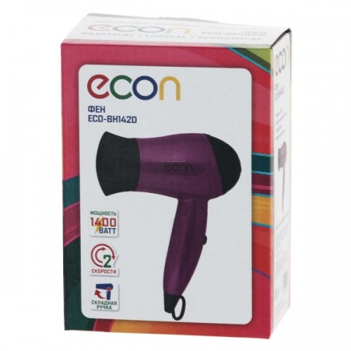 компактный фен, мощность 1400 Вт, режимов нагрева: 2, скоростей: 2