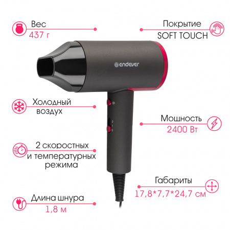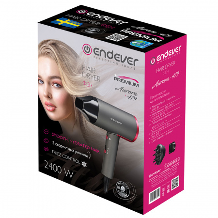 Устали от непослушных волос и тоски по идеальной пряди? Покончите с этими проблемами с помощью нашего фена Endever Aurora-479! Мощность 2400 Вт позволит вам справиться с любыми типами волос и создать захватывающие образы прямо у себя дома!