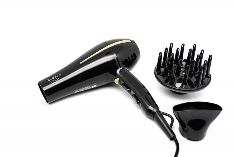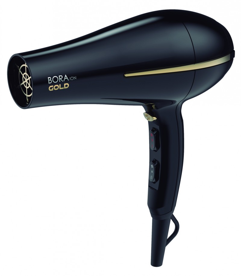 Легкий фен для волос Bora Gold с мощностью 2200 Вт и DC мотором выполнен в классическом черном цвете с эффектными золотыми вставками. Он оснащен ионно-керамической технологией (Ceramic Ion), благодаря которой улучшается внешний вид волос и уменьшается их пушистость. Керамическое покрытие обеспечивает высокую капиллярность и равномерный нагрев, а также эмиссию ионов, являясь отличным теплопроводником. Изюминкой этого фена является использование эфирного масла арганы на передней решетке прибора, благодаря которому сохраняется естественный блеск волос. Масло плодов аргании – это эфирное масло, которое восстанавливает жизненную силу тусклых волос благодаря своим мощным косметическим свойствам: проникая с потоком воздуха оно оказывает успокаивающее и смягчающее действие на волосы, делая их мягкими, как шелк. Кутикулы волос уплотняются под действием масла, они становятся более послушными и легко укладываются.