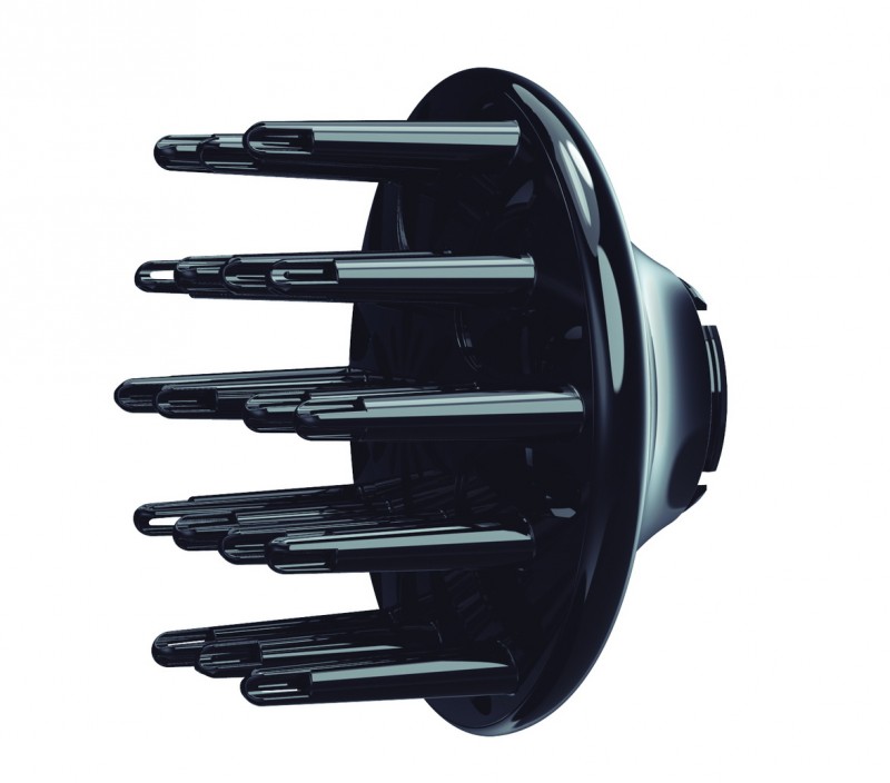 Фен эргономичный и удобный в использовании, имеет небольшой вес всего 470 грамм. У него 6 режимов работы: 3 температуры и 2 скорости, а также функция холодного обдува, которая помогает закрепить укладку. В комплект входит одна насадка-концентратор шириной 8 см для сушки и укладки на брашинг и диффузор диаметром 12 см с 18 длинными «пальчиками» 4,5 см.
