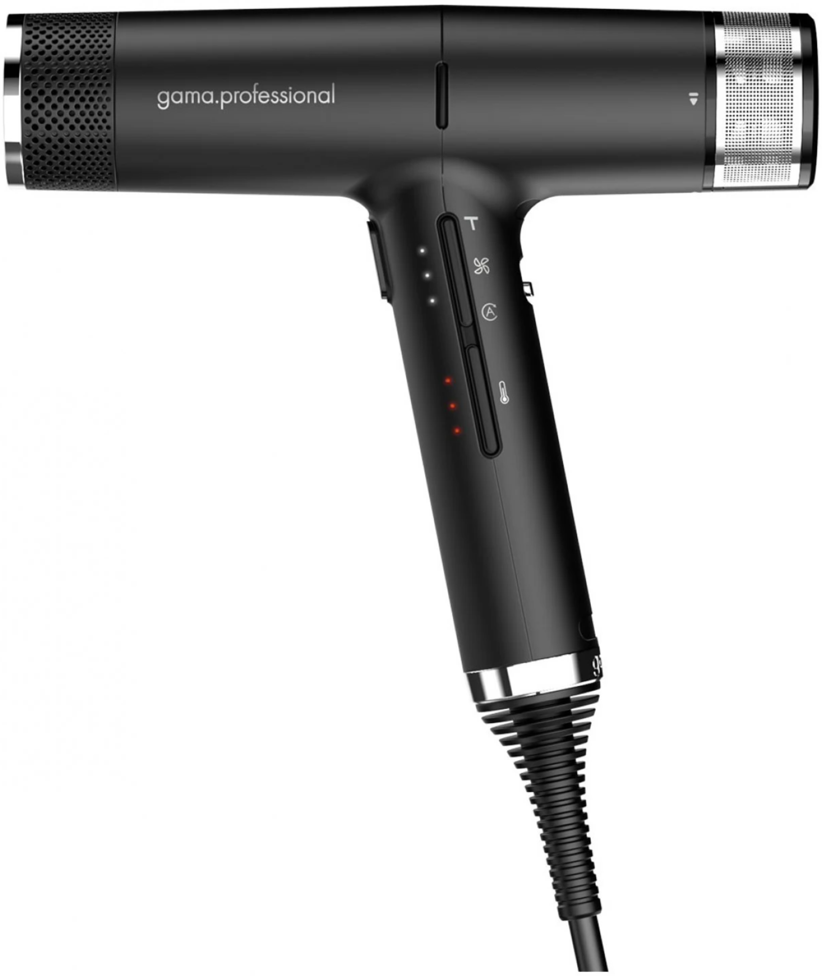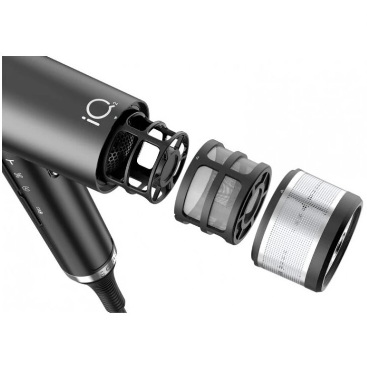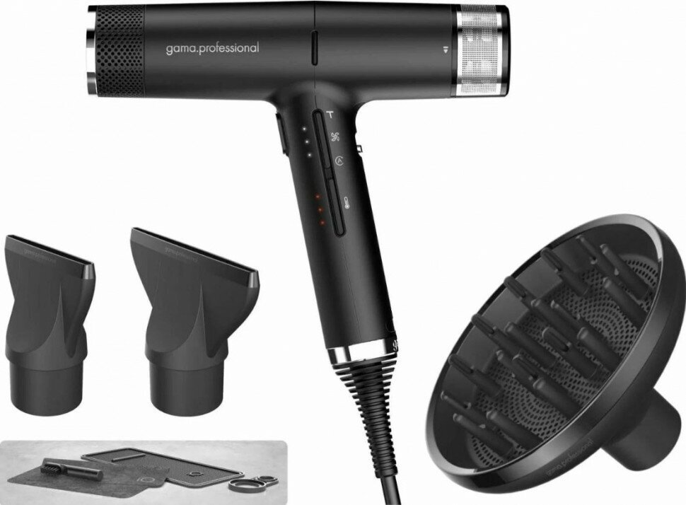 Фен; Насадки: 2 сопла-концентратора и диффузор; Набор для ухода: 2 запасных сменных сетчатых фильтра, щетка для чистки, мягкая салфетка, коврик для хранения, кольцо для подвешивания.