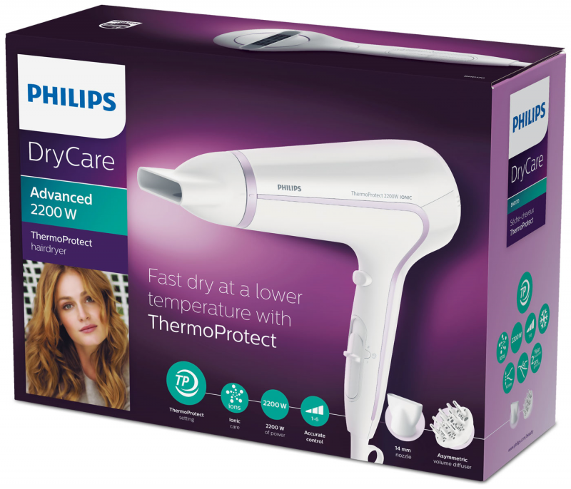 Быстрая укладка без вреда для волос. Philips BHD170/00 оснащен несколькими настройками скорости и температуры. Технология ThermoProtect позволит вам быстро высушить волосы при постоянной оптимальной температуре, а система ионизации обеспечит гладкие и блестящие волосы.