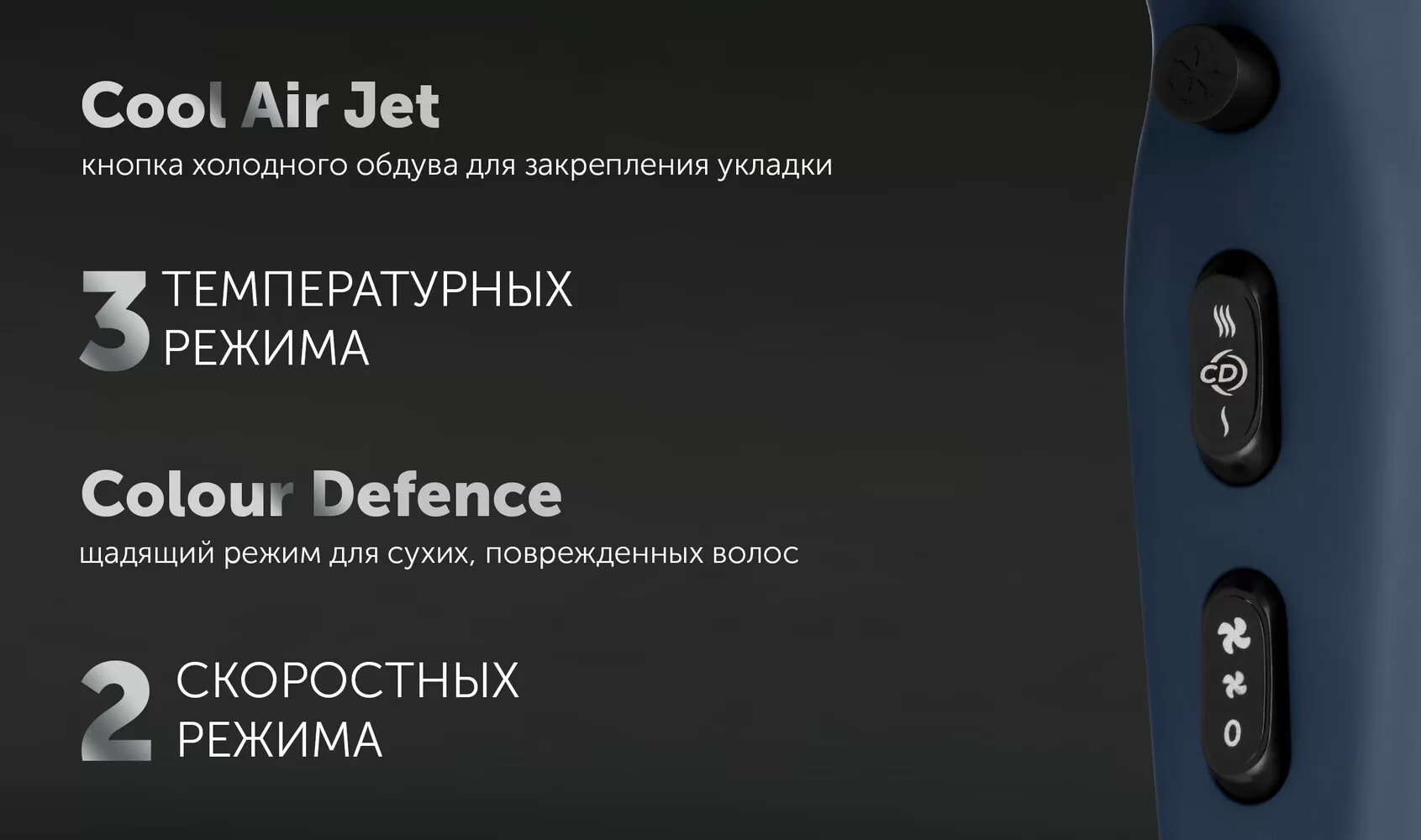 Режим Colour Defence - щадящий режим сушки бережно сушит сухие, поврежденные волосы; сохраняет насыщенный цвет и сияние