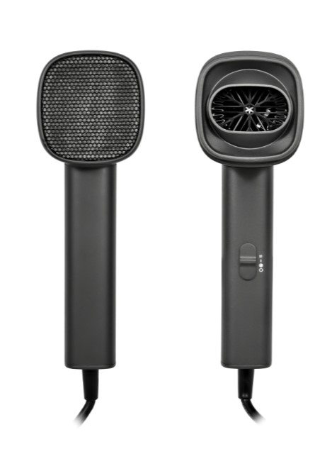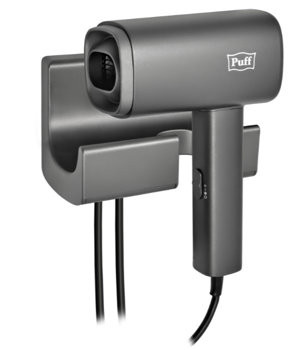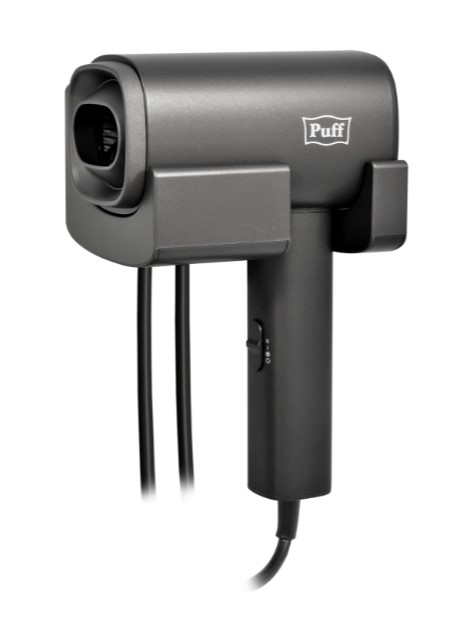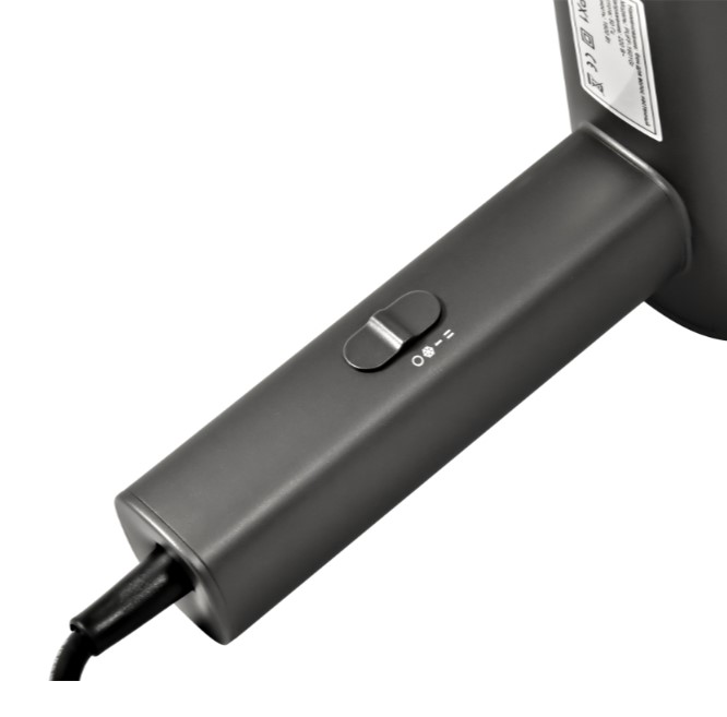 Фен работает только во время постоянного нажатия кнопки принудительного включения. Две скорости. Удобное крепление. Кнопка включения электричества. С опцией холодного воздуха.