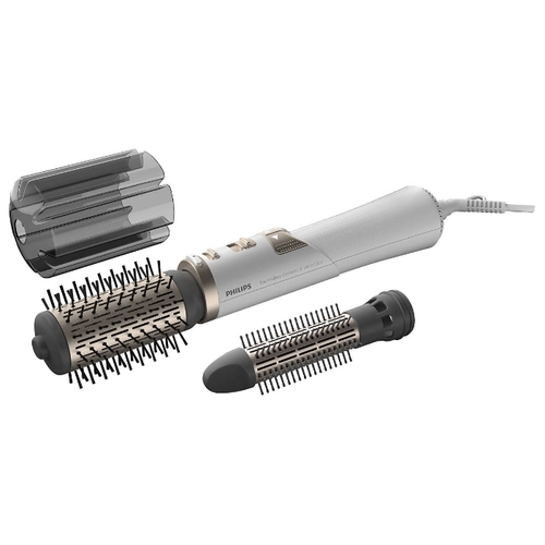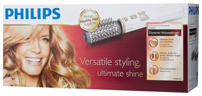 С помощью фена-щётки Philips HP8664 Volumebrush мощностью 1000 Вт можно быстро высушить и уложить причёску. Не повредить волосы помогут керамическое покрытие щётки и натуральная щетина. Функция ионизация эффективно снимает статическое электричество.