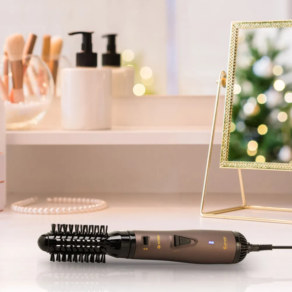 Высушить волосы и уложить их в прическу поможет фен-щетка с тремя температурными режимами и тремя скоростями воздушного потока. Максимальная мощность устройства — 1000 Вт. В приборе имеются три насадки: две термощетки диаметром 20 мм и 33 мм и концентратор, направляющий поток воздуха на определенные пряди для получения задуманного вами результата. Зафиксировать готовую прическу можно, включив подачу холодного воздуха. Пользоваться феном-щеткой очень удобно, благодаря вращающемуся шнуру длиной 1,8 м. По окончании работы прибор можно подвесить за удобную петельку. Стоит отметить надежность устройства: защита от перегрева гарантирует безупречную службу на протяжении многих лет.