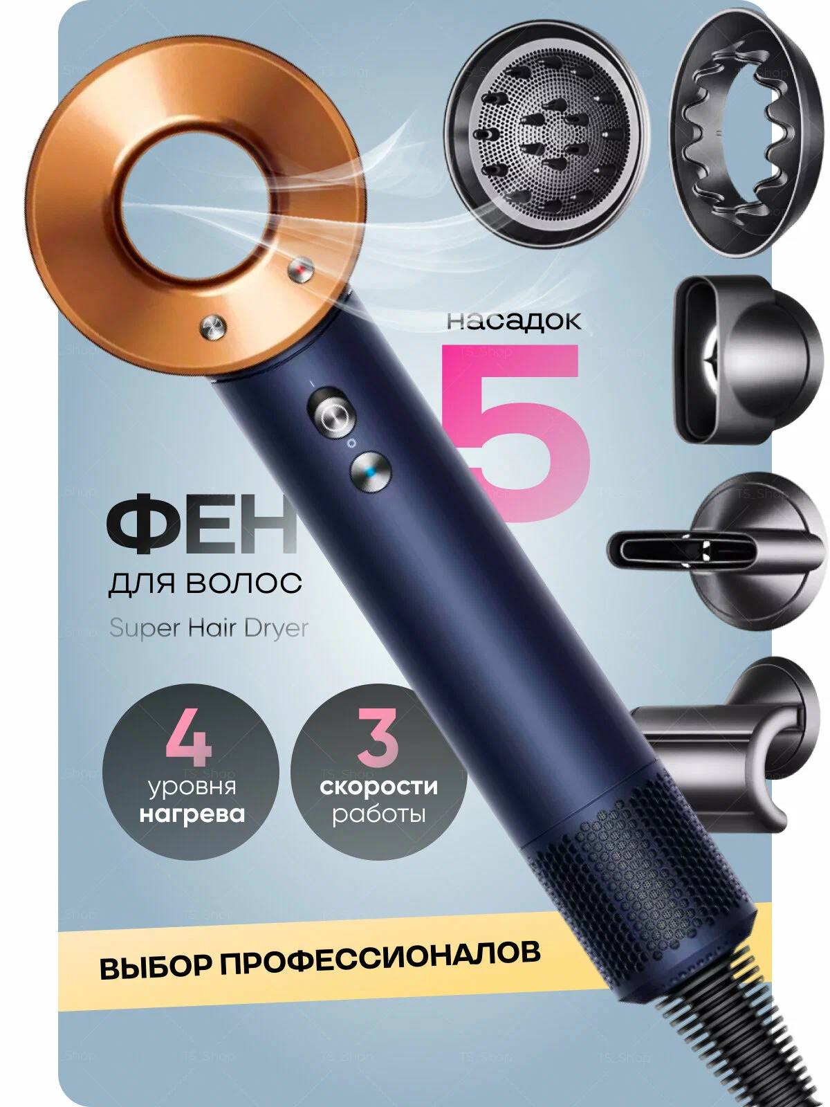 фен для волос; 5 магнитных насадок: насадка концентратор, насадка диффузор, для непослушных волос, для бережного высушивания, для создания направленного потока; инструкция