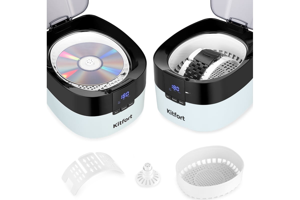 Главное преимущество КТ-6052 - это возможность очищать предметы сложных форм. В комплекте есть подставка для часов и держатель для дисков с разделителем. Поэтому мы можете удобно очистить ремешок от часов или сразу 2 диска одновременно.