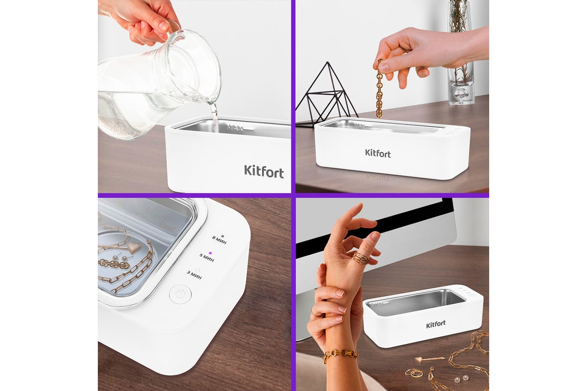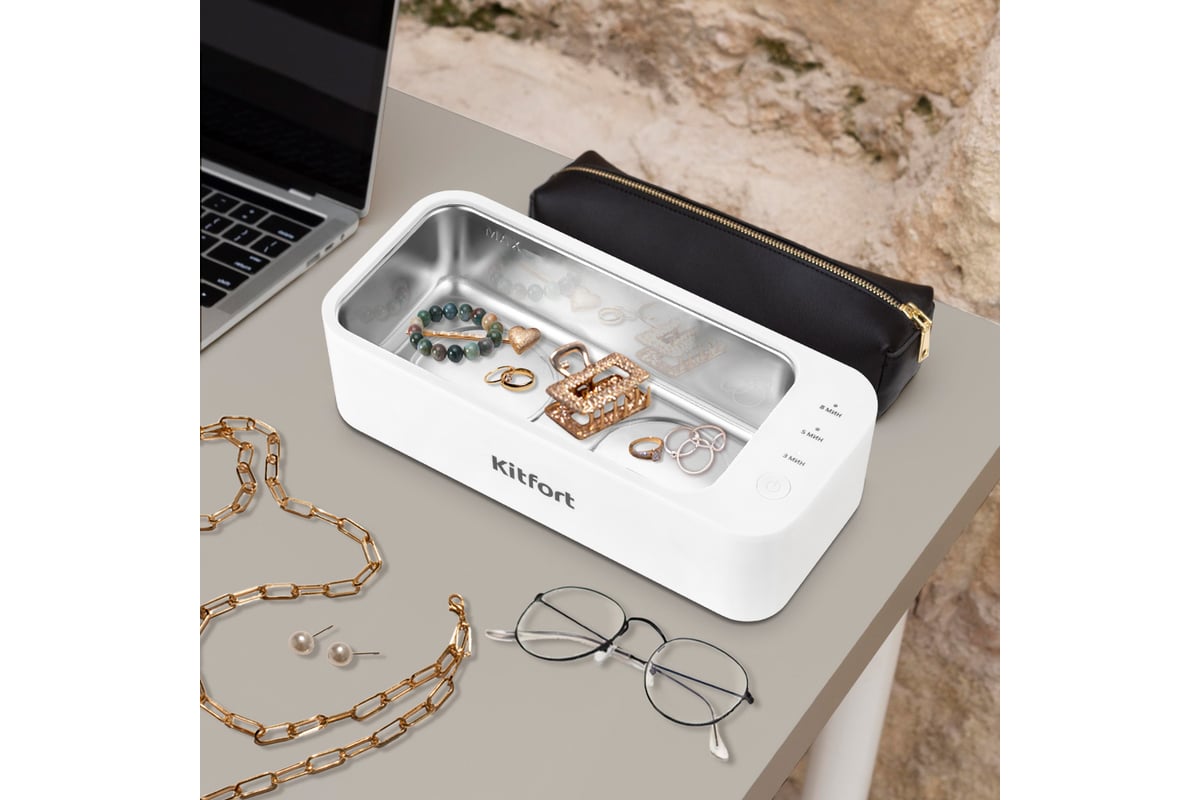 Ультразвуковая мойка КТ-6066 поможет эффективно очистить и продезинфицировать небольшие изделия из металла, пластика и стекла. Вам нужно налить воду в мойку и положить в нее изделия, например, золотые украшения, браслет от часов, серьги, зубные протезы, очки и прочее.