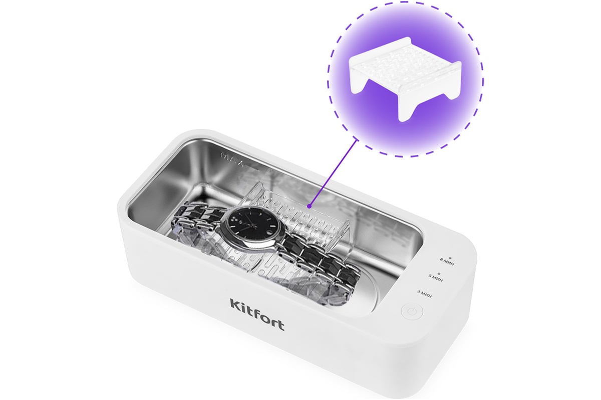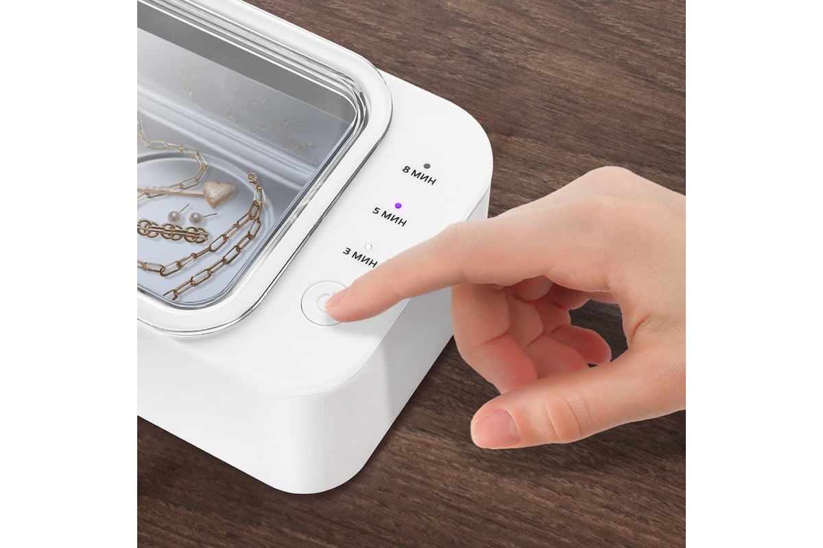 Корпус прибора сделан из пластика, а резервуар, в который помещаются предметы для очистки — из нержавеющей стали. Прозрачная пластиковая крышка позволит наблюдать за процессом очистки.