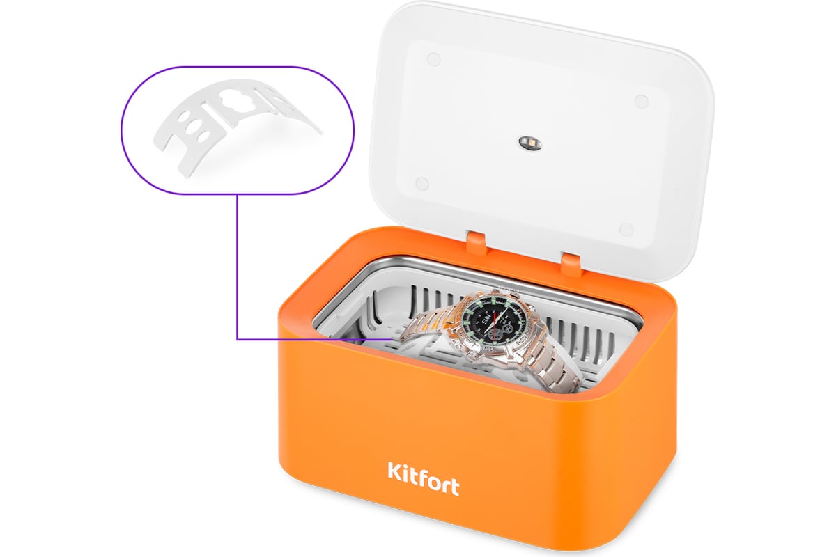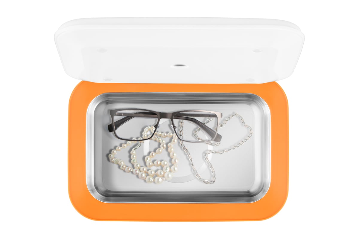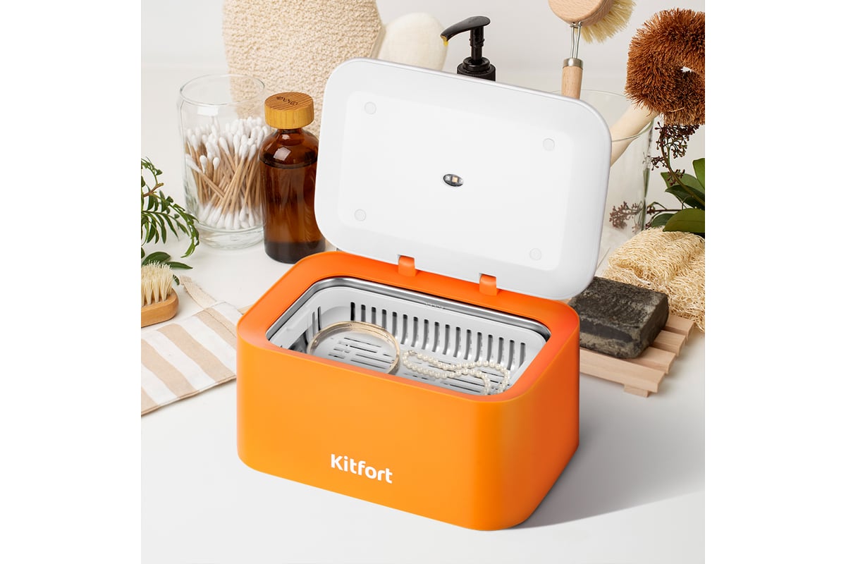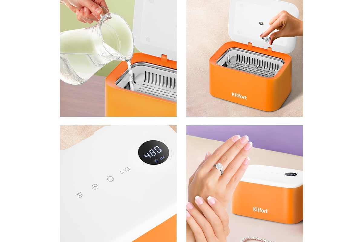 Корпус прибора сделан из пластика, а резервуар, в который помещаются предметы для очистки, — из нержавеющей стали.