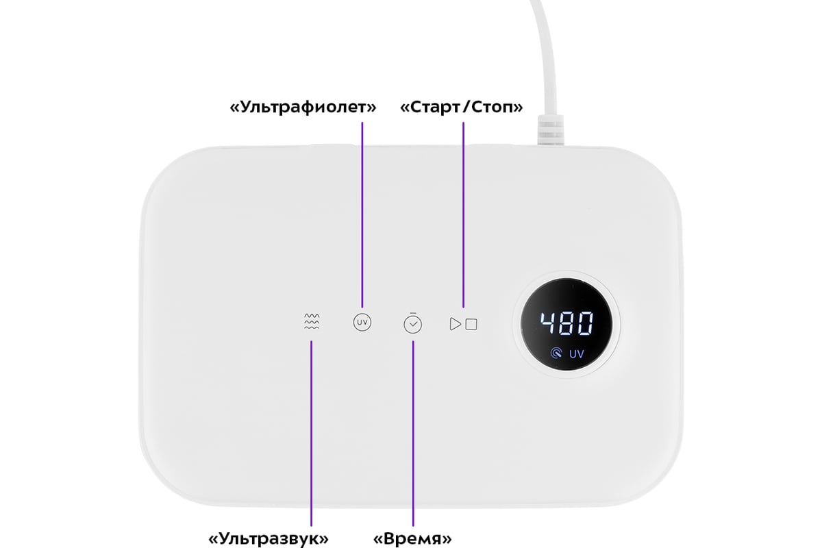 Управление прибором осуществляется при помощи сенсорных кнопок на панели управления. Вы можете включить ультразвуковую очистку и очистку ультрафиолетом одновременно или по отдельности и выбрать время работы: 90, 180, 300, 480, 600 или 900 секунд. По прошествии предустановленного времени работы режима мойка автоматически отключается.