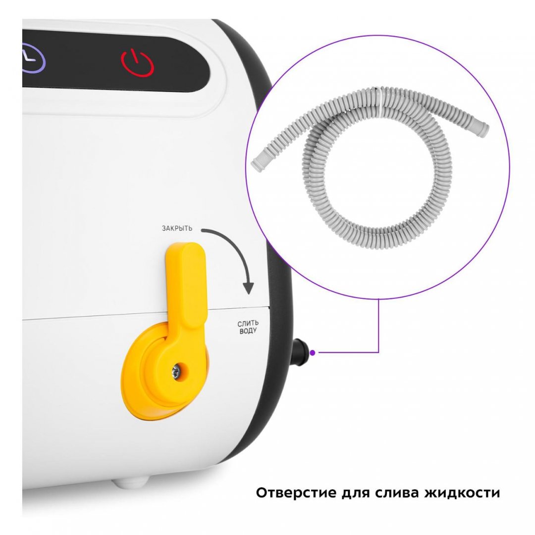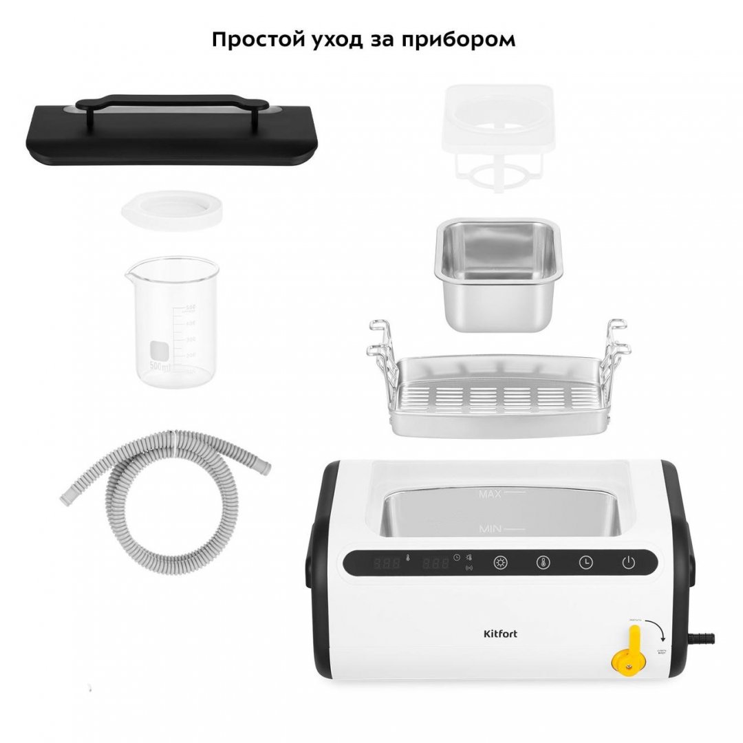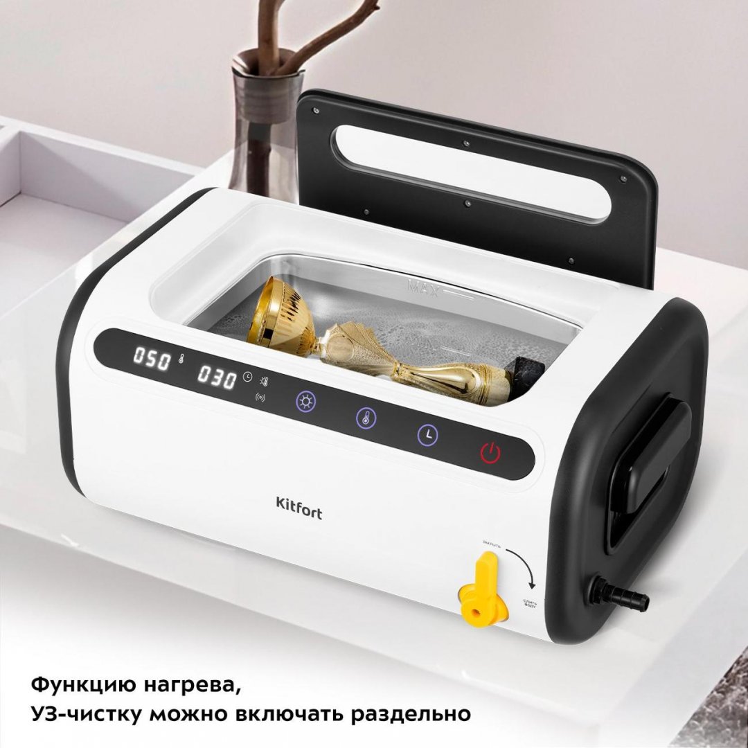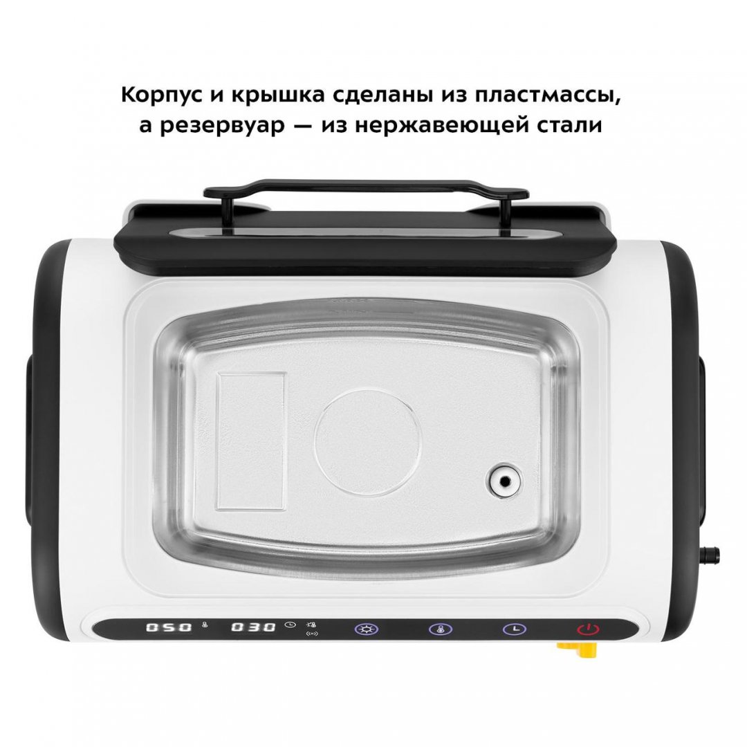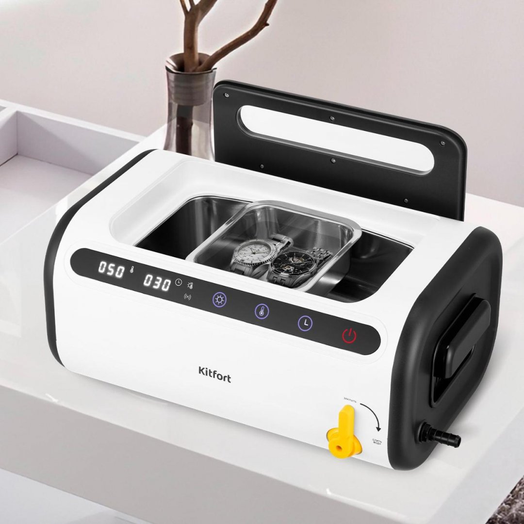 Емкость дополнительного резервуара: 1.2 л. Емкость стакана: 0.5 л. Длина сетевого шнура: 1 м. Настраиваемые температура и время работы. Большой резервуар. Эффективная очистка предметов. Подогрев. Удобный слив воды из резервуара.
