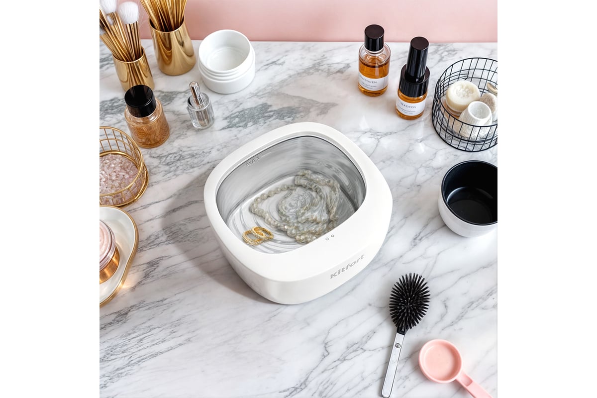 Корпус прибора сделан из пластика, а резервуар, в который помещаются предметы для очистки, — из нержавеющей стали.