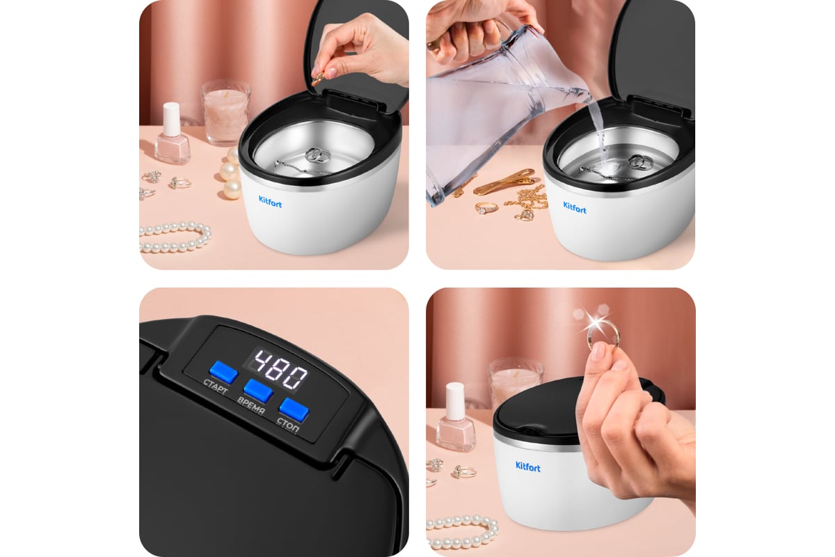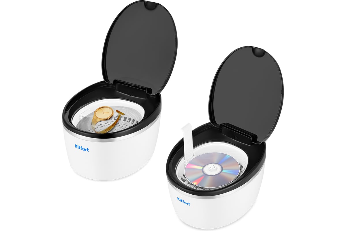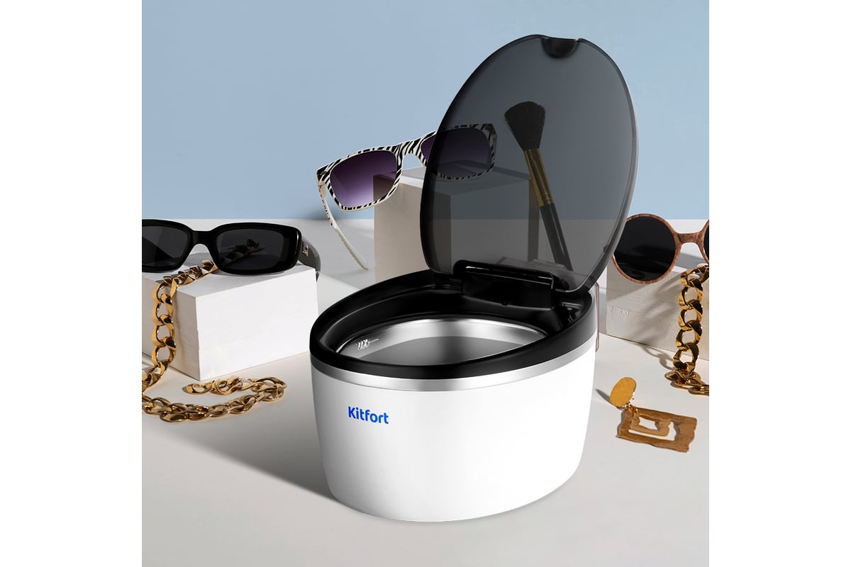 Корпус прибора сделан из пластика, а резервуар, в который помещаются предметы для очистки, — из нержавеющей стали. Прозрачная крышка и декоративная подсветка позволяют наблюдать за процессом очистки.