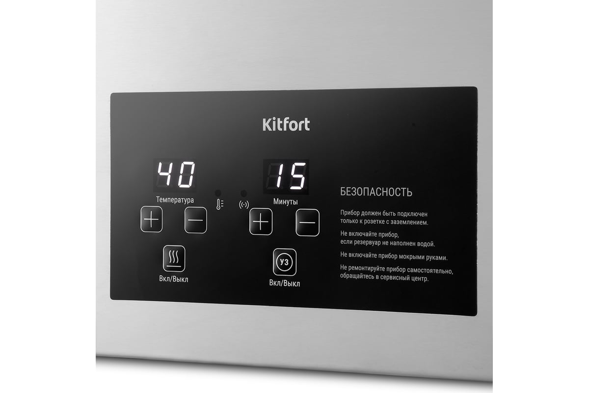 Управление прибором осуществляется при помощи кнопок на панели управления. Вы можете выбрать время работы 5–30 минут с шагом 5 минут, после которого мойка автоматически отключается, и температуру нагрева воды 20–80 °Cс шагом 5 °C. Во время работы на дисплеях отображаются температура и оставшееся время работы. Можно включить только нагрев, только УЗ-чистку или и нагрев, и чистку одновременно.