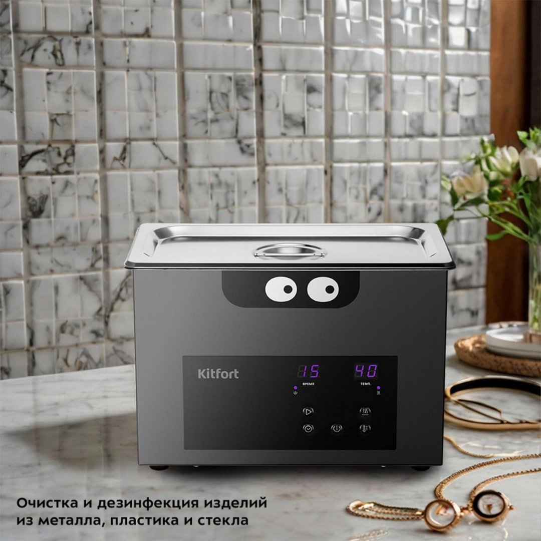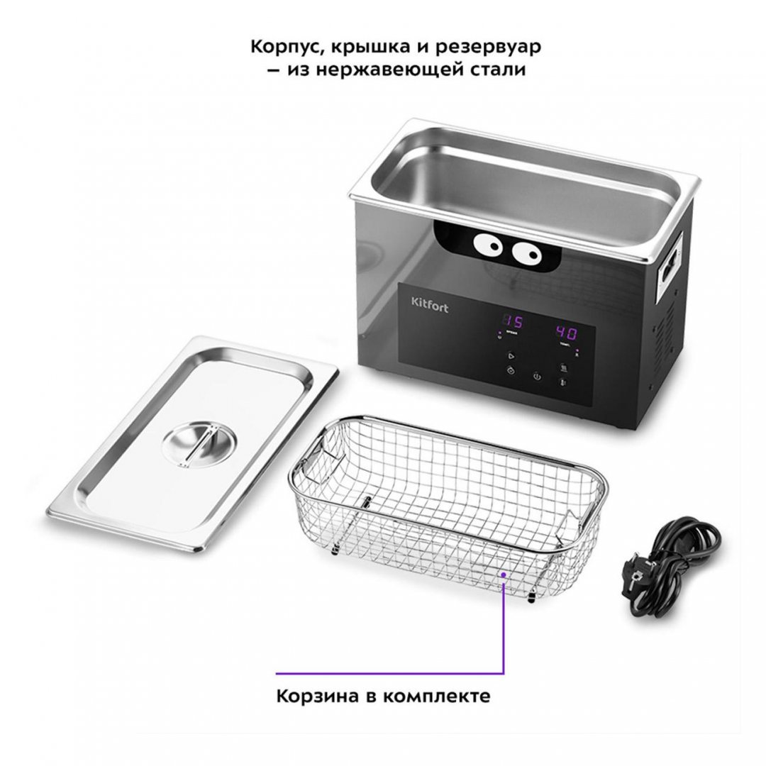 Ультразвуковая мойка КТ-6336 поможет эффективно очистить и продезинфицировать небольшие изделия из металла, пластика и стекла. Благодаря большому размеру вы можете очищать более крупные предметы или много небольших предметов за 1 раз.Применение ультразвука значительно ускоряет процесс очистки и повышает качество очистки. В качестве жидкости в ультразвуковой мойке можно использовать воду, а также специальные чистящие или дезинфицирующие растворы.Вы можете выбрать время работы 5–30 минут с шагом 5 минут, после которого мойка автоматически отключается, и температуру нагрева воды 5–80 °C с шагом 5 °C. Во время работы на дисплеях отображаются установленная температура и оставшееся время работы.Кнопка «Нагрев» включает и отключает нагрев до выбранной температуры. При включении нагрева загорается индикатор нагрева, на дисплее отображается текущая температура воды в резервуаре. Когда вода достигнет заданной температуры, нагрев отключится.Для удобства транспортировки устройства с двух сторон предусмотрены ручки.Корпус прибора, крышка и резервуар сделаны из нержавеющей стали. Главное преимущество ультразвуковых моек — это возможность очищать предметы сложных форм. Для удобного размещения предметов в комплект входит корзина.