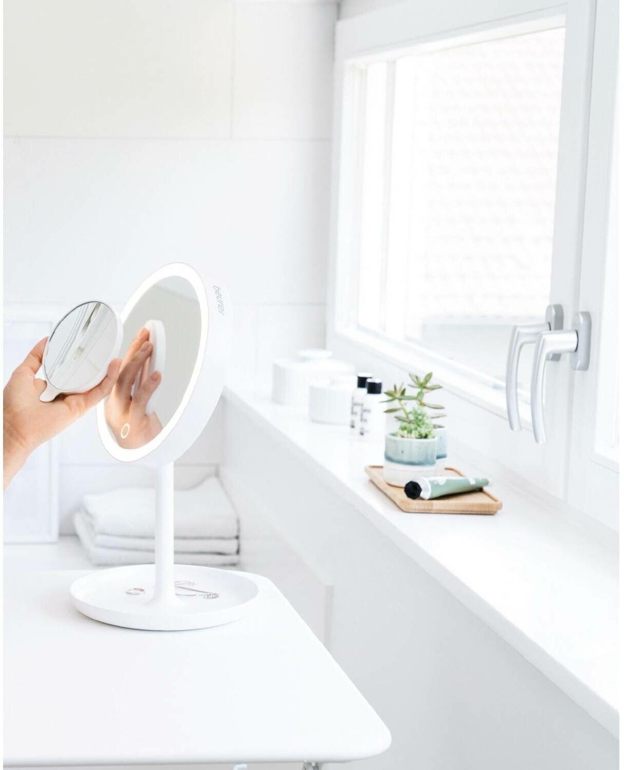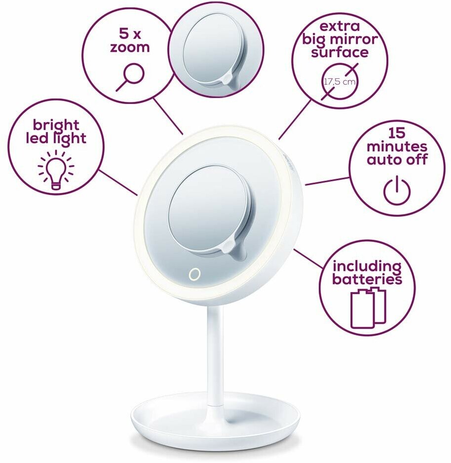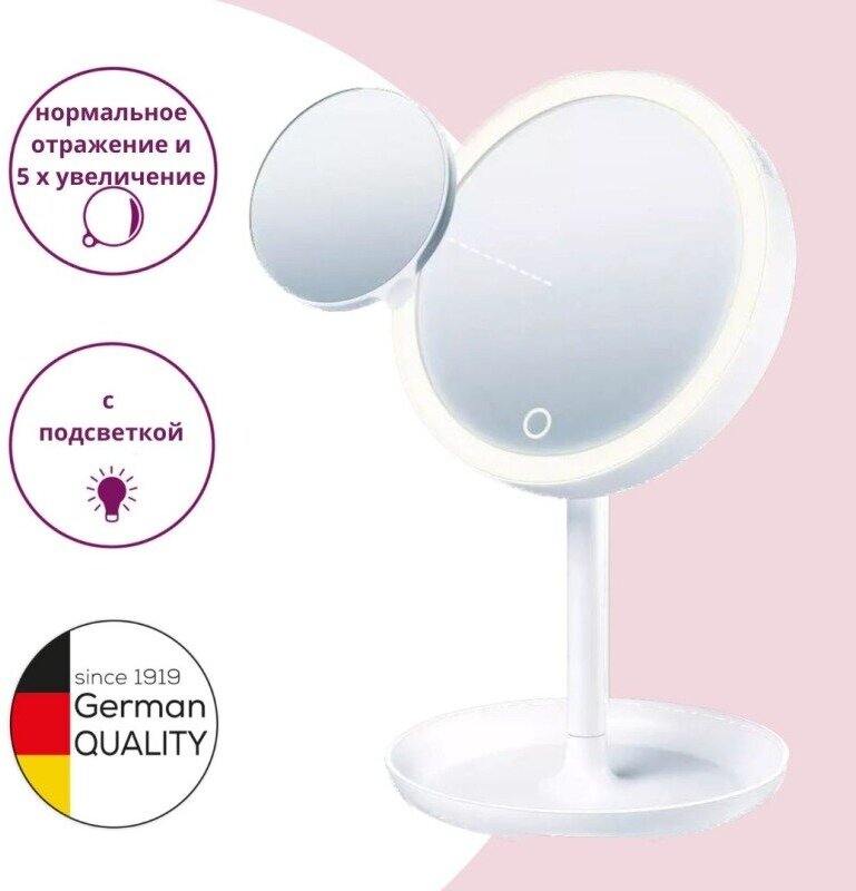 Косметическое двухстороннее зеркало Beurer BS45 584.04 — удобный и практичный аксессуар для уходовых процедур в домашней обстановке. Диаметр зеркальной поверхности составляет 17,5 см, а высота подставки — 33,7 см. Корпус изготовлен из высококачественного пластика.