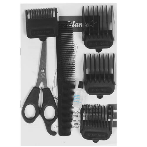 расческа , масло , щеточка для чистки , ножницы , документация , комплект насадок (3, 6, 9, 12 мм)