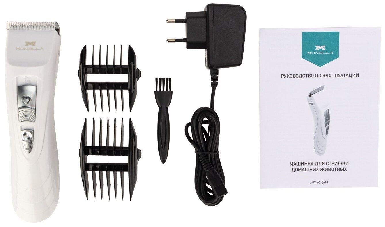 Триммер для животных Monella 60-0618 оснащен световой индикацией для отслеживания уровня заряда прибора. На полную зарядку модели уходит 3 часа. Машинка работает в одном из четырех режимов регулировки лезвия. Это подходит для создания любых модельных стрижек. Блок питания поставляется в комплекте. Лезвие выполнено в форме буквы R. Материал его исполнения — вольфрамовая сталь с покрытием из титана для обеспечения противокоррозийных свойств. Заряженное устройство работает непрерывно в течение 4 часов. Для ухода используется специальная кисточка.
