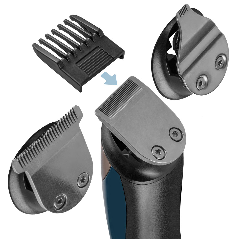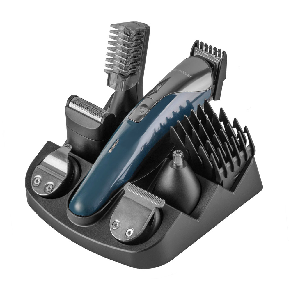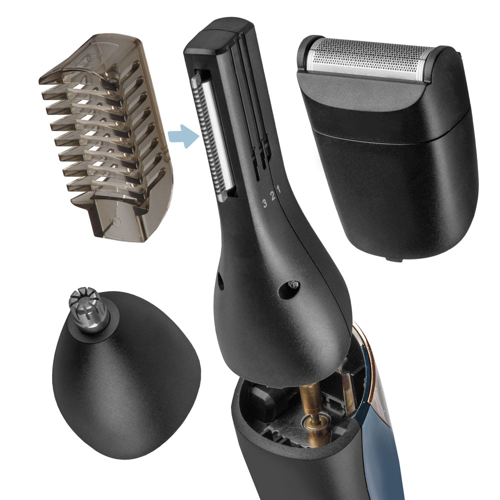 Корпус машинки, Триммер для тела, Бритва, Триммер для контурной стрижки, Полноразмерный триммер для стрижки волос, Триммер для стрижки волос в носу и ушах, Триммер для бороды и бакенбард, 6 сменных насадок, USB кабель, Расческа, Щетка для очистки, Масло,