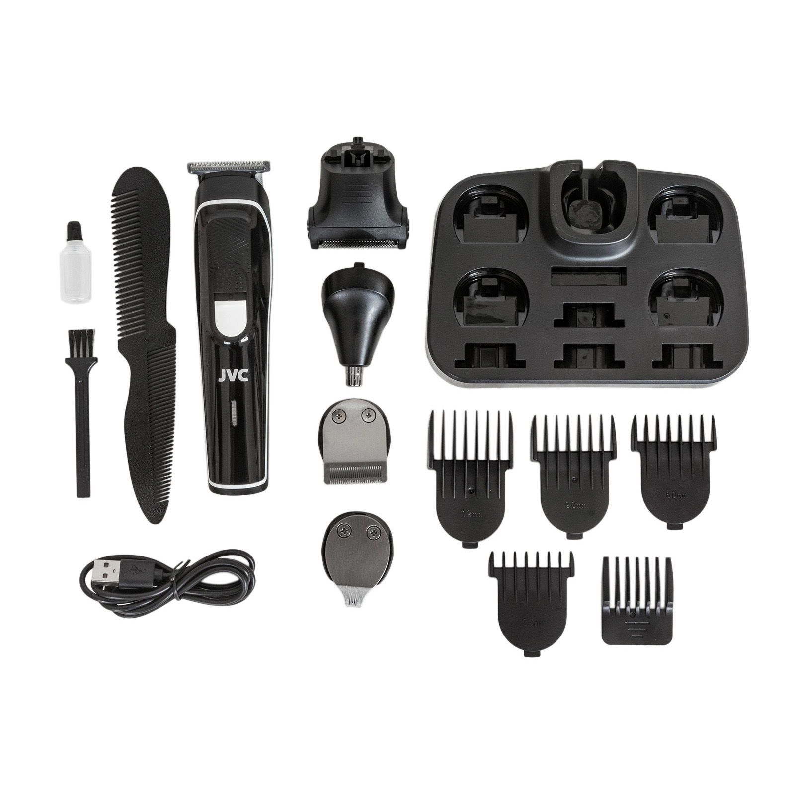 Полная комплектация подставка-пьедестал, полноразмерный триммер, 4 сменные насадки-расчески для полноразмерного триммера, USB кабель, масло, щеточка для чистки, расческа, триммер для носа, бритва, узкий триммер, триммер для тела, триммер для бровей, триммер для коррекции, гарантийный талон, инструкция на русском языке