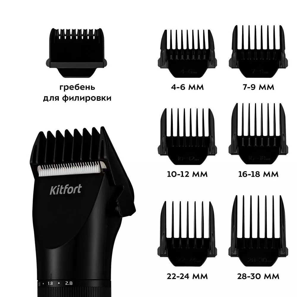 С помощью 6 съёмных гребней вы можете оставить волосы определённой длины и установить режим стрижки волос от 4 до 30 мм. Также в комплекте с машинкой идёт гребень для филировки (прореживания) волос.