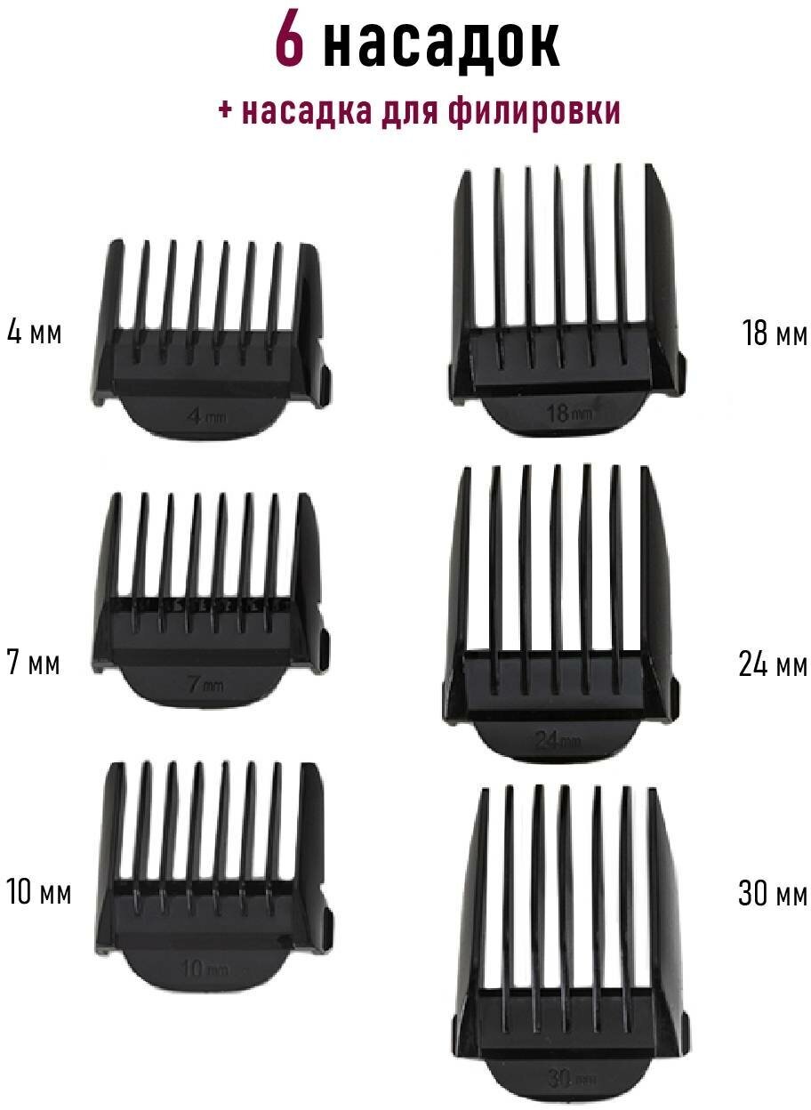 Насадки: 7 съемных регулируемых насадок 4/7/10/18/24/30 мм, насадка для филировки