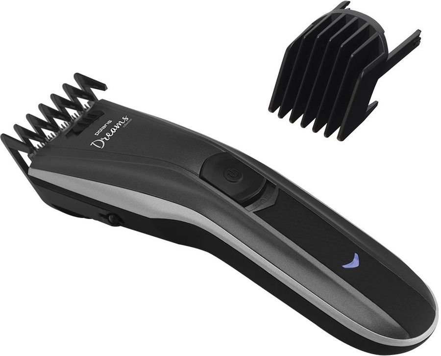 Машинка для стрижки работает от аккумулятора и от сети. Лезвия из нержавеющей стали. 2 съемные регулируемые насадки. 45 мин работы от аккумулятора: достаточно на несколько стрижек. Индикатор заряда и готовности к работе.