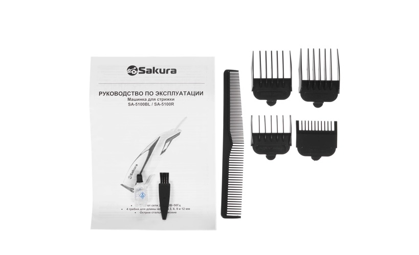 Комплектация защитная крышка, 4 насадки (3-6-9-12 мм), масло, щетка для чистки, расческа
