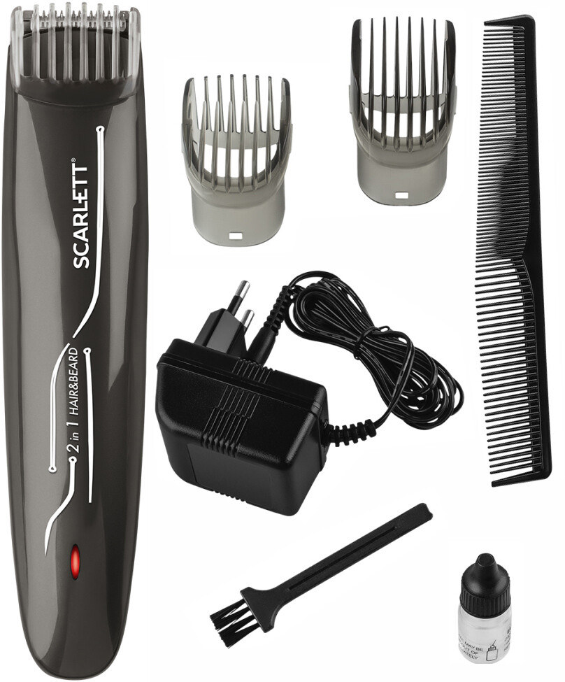 Две 9-позиционные насадки для стрижки волос и моделирования бороды: 1-я (1,2,3,4,5,6,7,8,9 мм), 2-я (10,11,12,13,14,15,16,17,18 мм). Щетка для чистки машинки. Масленка для машинки. Встроенный Ni-Cd 800mAh аккумулятор. Удобный механизм очистки лезвий.