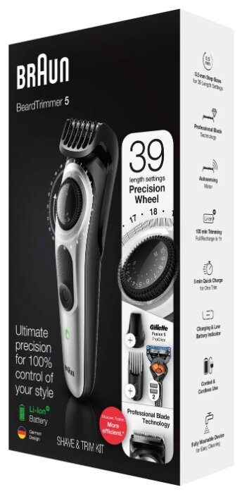 гребень 1 - 10 мм; гребень 11 - 20 мм; детальный триммер; щеточка для чистки; бритва Gillette Fusion5 ProGlide