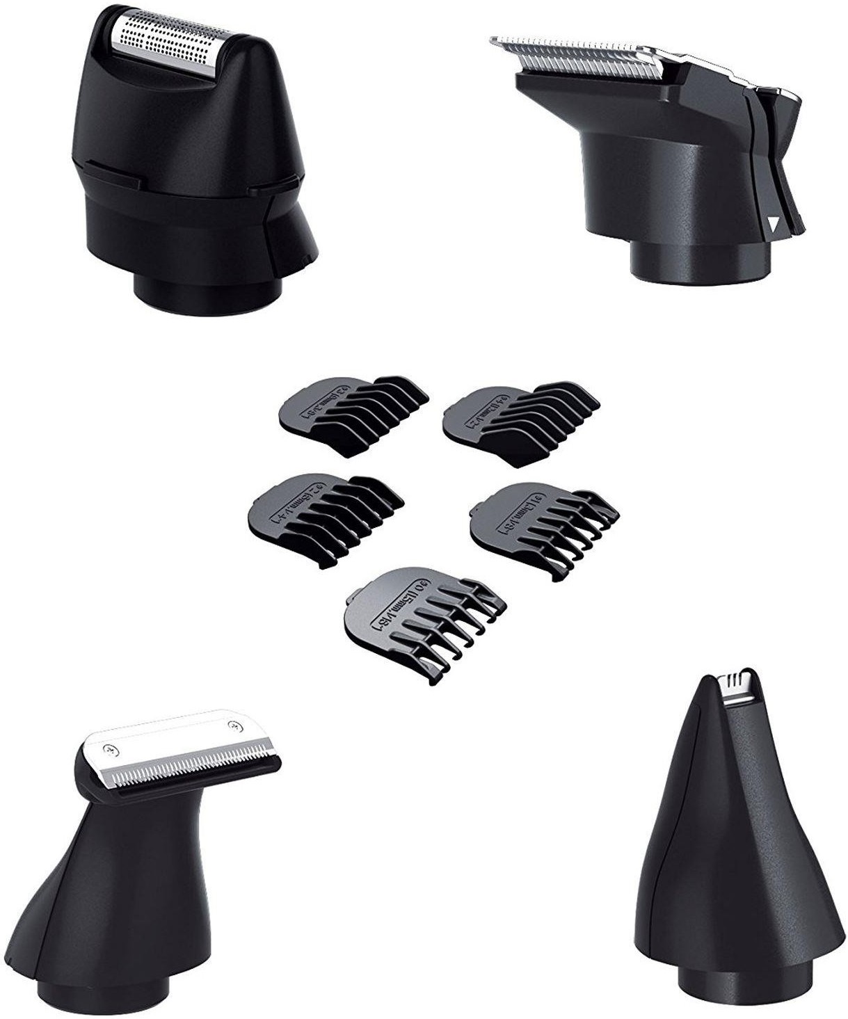 5 насадок, 1 регулируемая насадка (2-20 мм), сеточная мини-бритва, детальный триммер, триммер для носа и ушей, зарядное устройство, широкий триммер, документация, подставка
