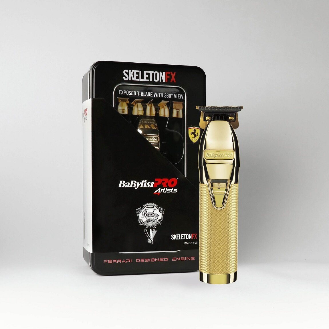 Триммер BaByliss PRO Skeleton FX7870GE - самый известный триммер Skeleton. Металлический корпус. Цифровой мотор с высоким крутящим моментом производит 7200 колебаний в минуту, обеспечивая высокую производительность. Триммер работает с любым типом волос. Мощность подстраивается автоматически в режиме реального времени. Легкий вес прибора, сниженный уровень вибрации и шума гарантируют комфортную работу. Полной обзор рабочей поверхности благодаря используемому открытому лезвию. Возможность настройки нулевого зазор. Неподвижный нож имеет никель-титановое покрытие, а подвижное - DLC (Diamond Like Carbon). Это обеспечивает наибольший комфорт во время работы, т.к. лезвия почти не нагреваются. Для очистки триммера от загрязнений в комплекте поставляются щеточка и масло для лезвий. Петелька для подвешивания предназначена для удобного использования и бережного хранения прибора.