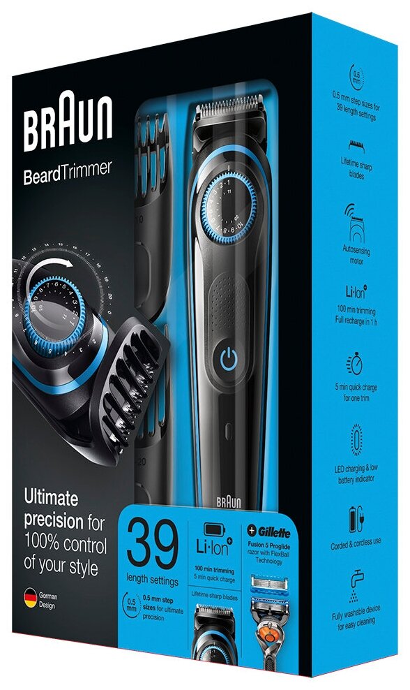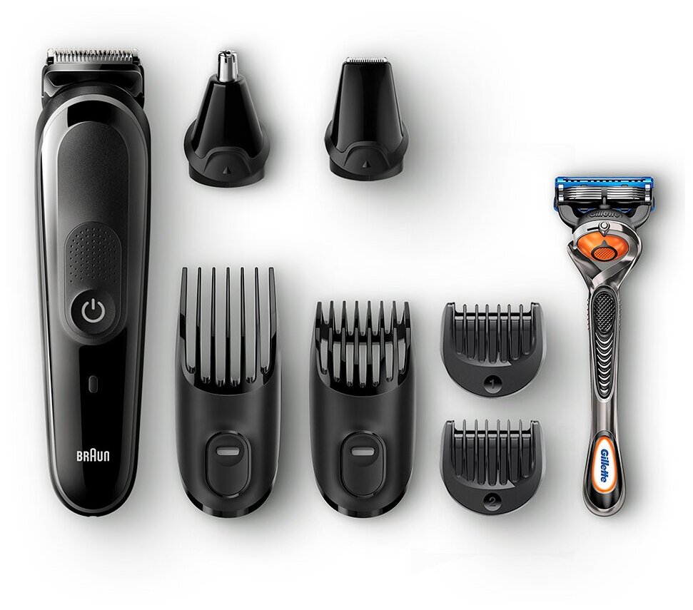 насадка-гребень для коротких волос 3-11 мм; насадка-гребень для длинных волос 13-21 мм; насадка-гребень 2 мм; насадка-гребень 1 мм; насадка для точного стайлинга; насадка для носа и ушей; щеточка для чистки; бритва Gillette Fusion ProGlide