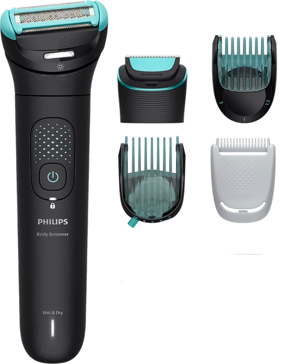 насадка-бритва (2 шт.), насадка для чувствительных зон, регулируемая насадка, гребень для тела