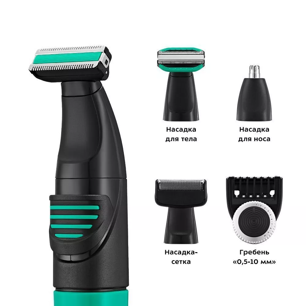 В комплекте к триммеру идёт 4 насадки: гребень с регулировкой длины, насадка для носа, которой можно также удалять волосы из ушей, насадка-сетка для бритья короткой щетины, насадка-триммер для бритья и подравнивания волос на лице и насадка для тела.