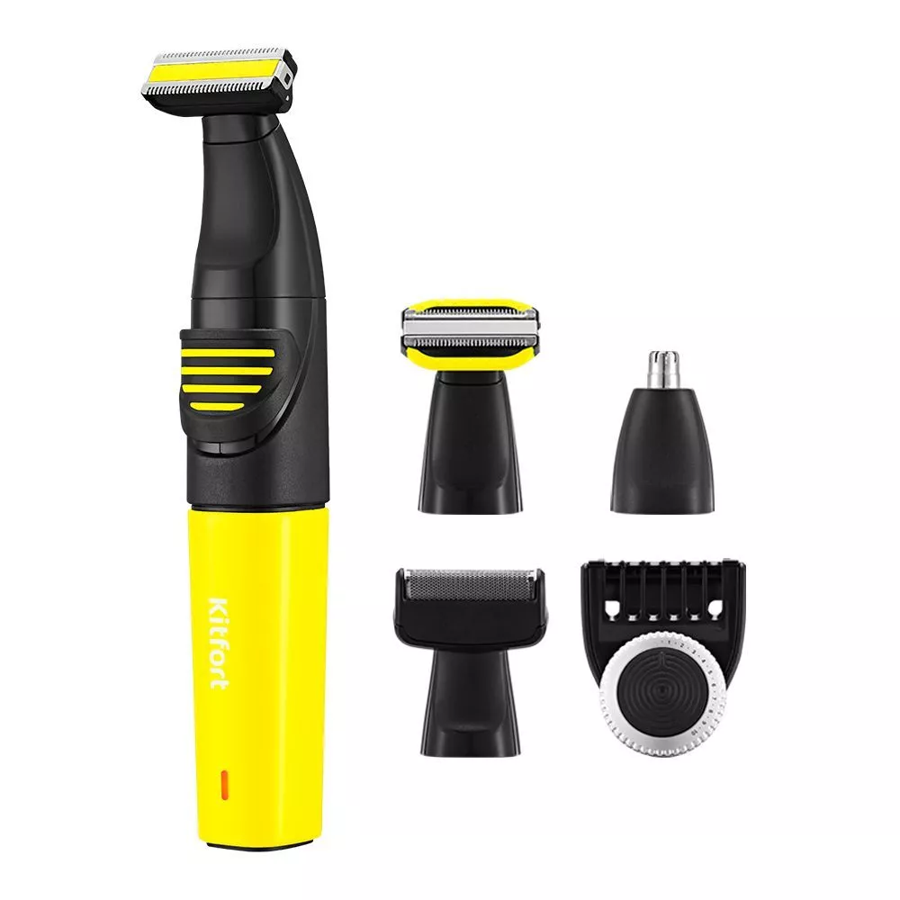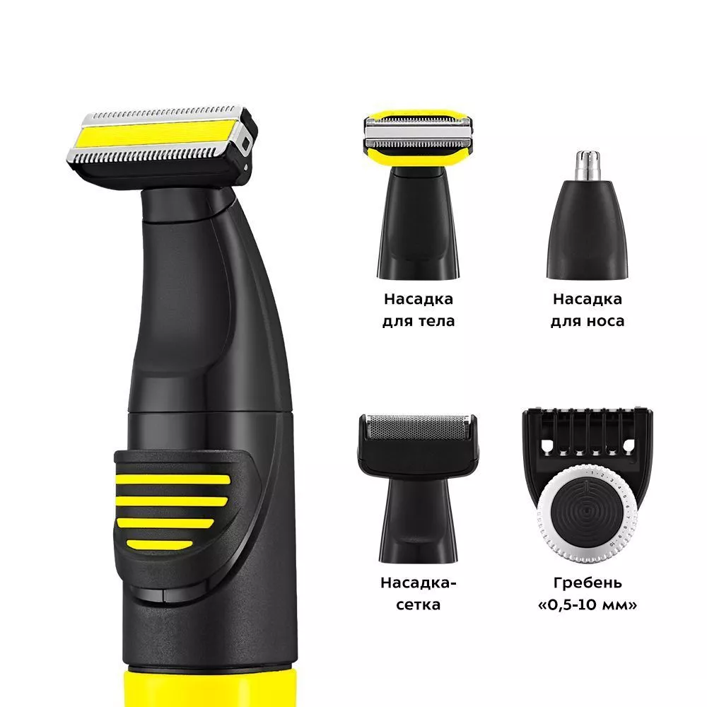 В комплекте к триммеру идёт 4 насадки: гребень с регулировкой длины, насадка для носа, которой можно также удалять волосы из ушей, насадка-сетка для бритья короткой щетины, насадка-триммер для бритья и подравнивания волос на лице и насадка для тела.